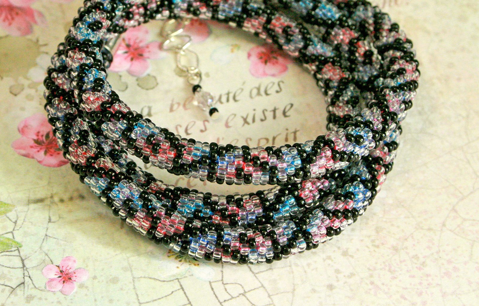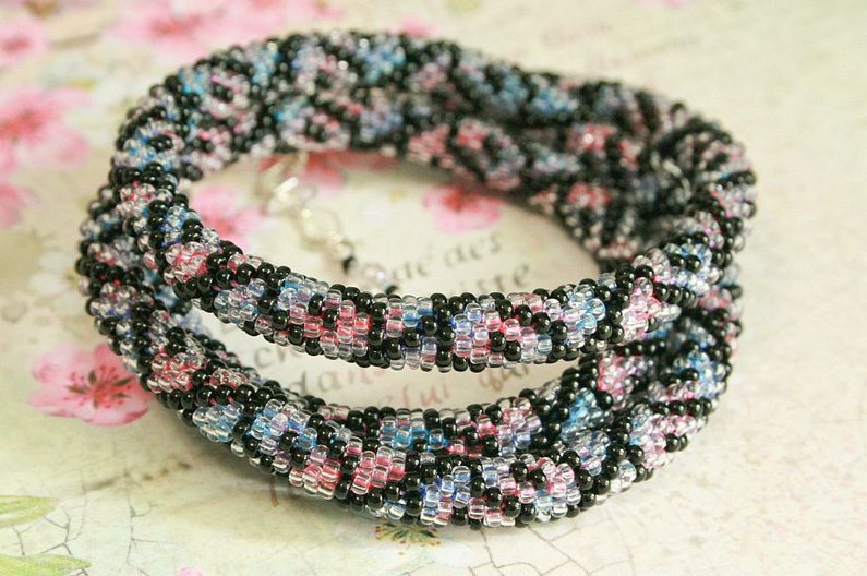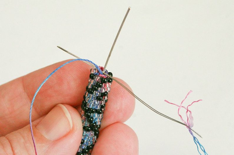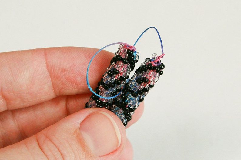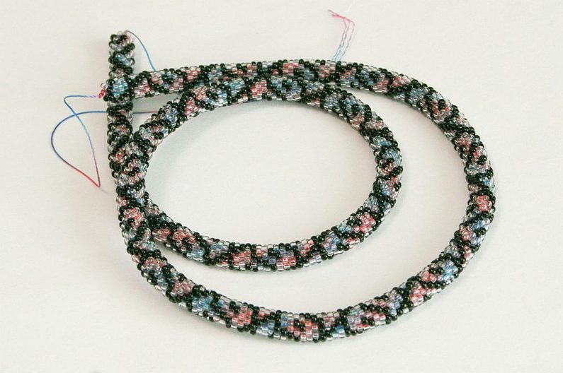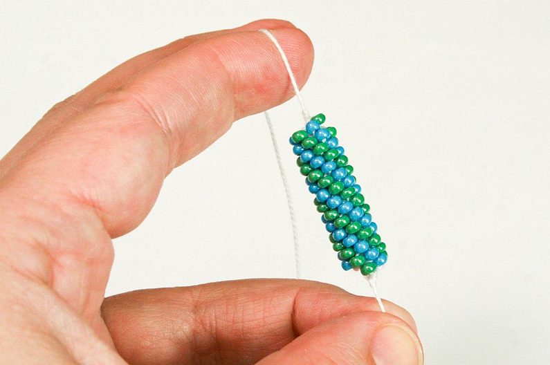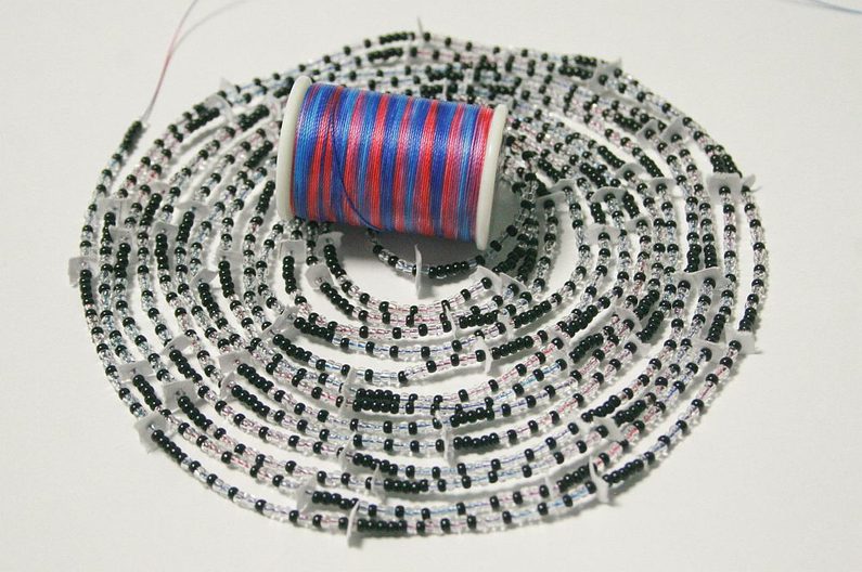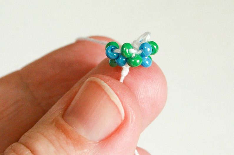 Nejdříve navlékněte na přízi korálky podle vzoru na obr.1. Pro dutinku s délkou 45cm opakujte vzor 70 krát.