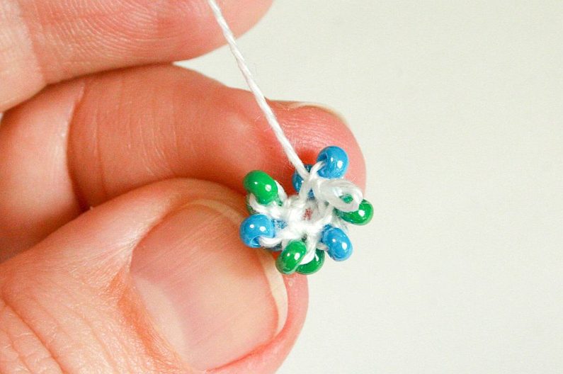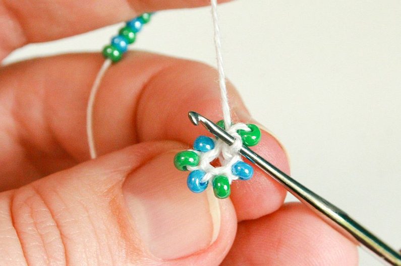 Stejně udělejte ještě 5 řetízkových ok s korálky (Obr.14). Dále spojte řetízek do kroužku tak, že provléknete háček prvním základním očkem (Obr.15) a protáhněte přízi oběma oky najednou (Obr.16).