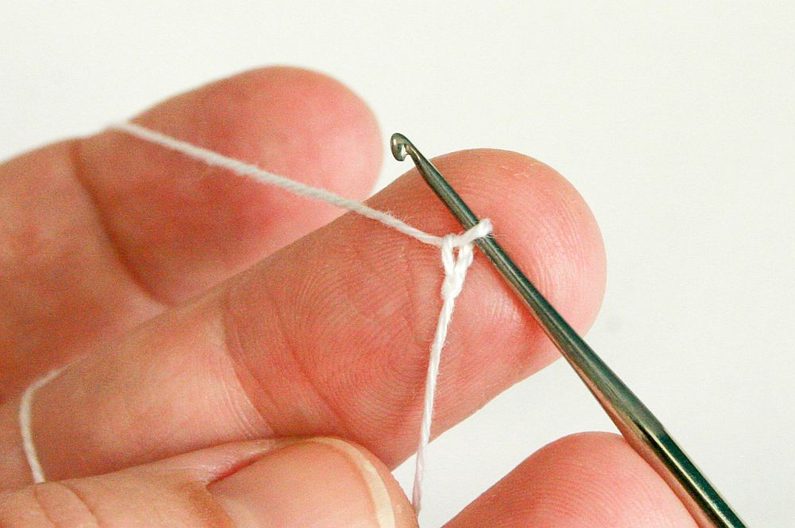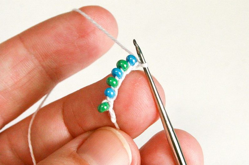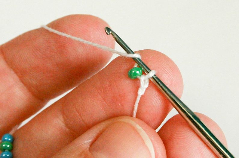 Pro lepší názornost si ukážeme techniku háčkování pevným okem na světlé přízi, na 6 korálků dokola a s použitím větších korálků. Udělejte základní oko, pak jedno řetízkové oko (Obr.11). Posuňte perličku co nejblíže k háčkování, pak za perličkou zachyťte přízi a udělejte další řetízkové oko (Obr.12-13).