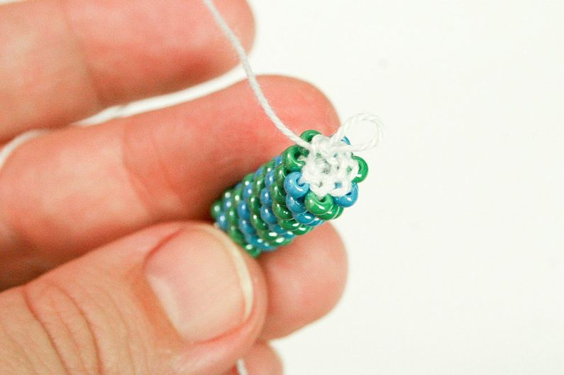 Přidáme perličky do druhé řady a pak háčkujeme pevná oka s perličkami spirálou kolem dokola (Obr. 21). Pokud mají všechny perličky ve všech řadách otočenou dírku po směru háčkování (nahoru), postupovali jste správně (Obr.22). Jakmile budete mít dutinku v požadované délce, uháčkujte poslední řadu bez korálků (Obr. 23-25).