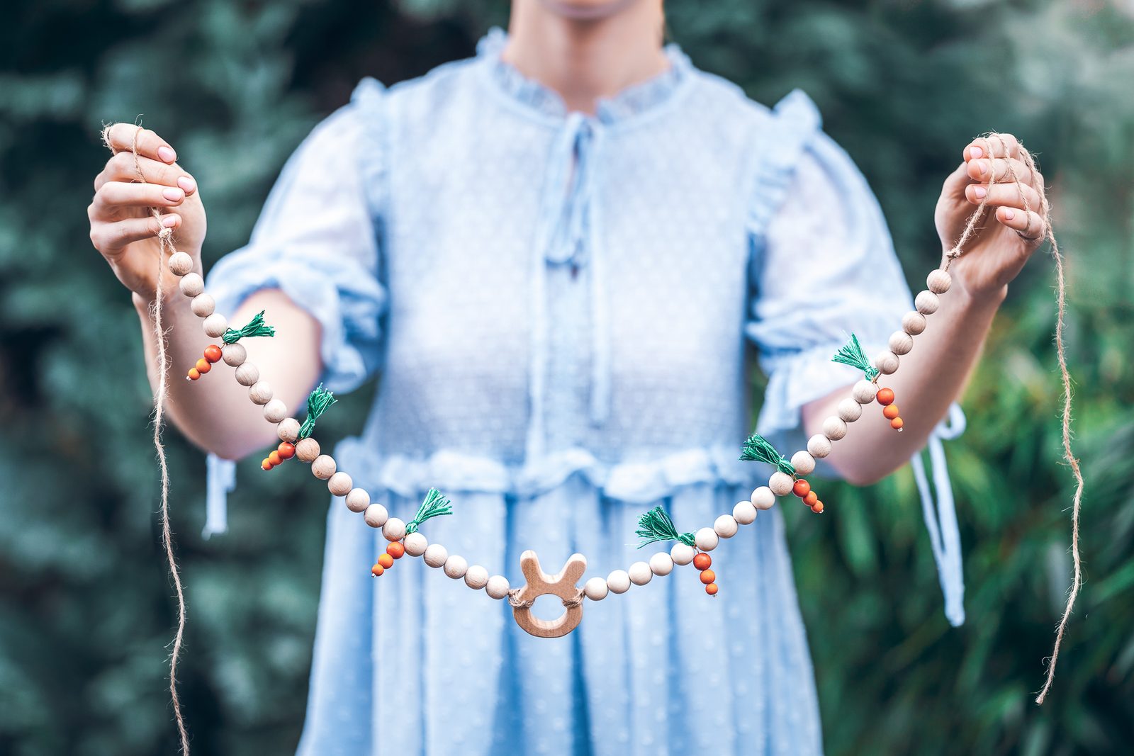 Na každou stranu navlečeme 20 dřevěných korálků. Chcete-li girlandu delší, je potřeba si počet materiálu přepočítat.