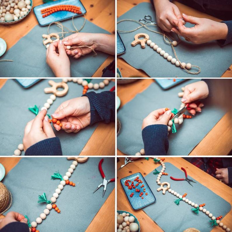 Mrkvičky zavěsíme očkem nýtu mezi velké dřevěné korálky a očko poté pomocí kleští uzavřeme.