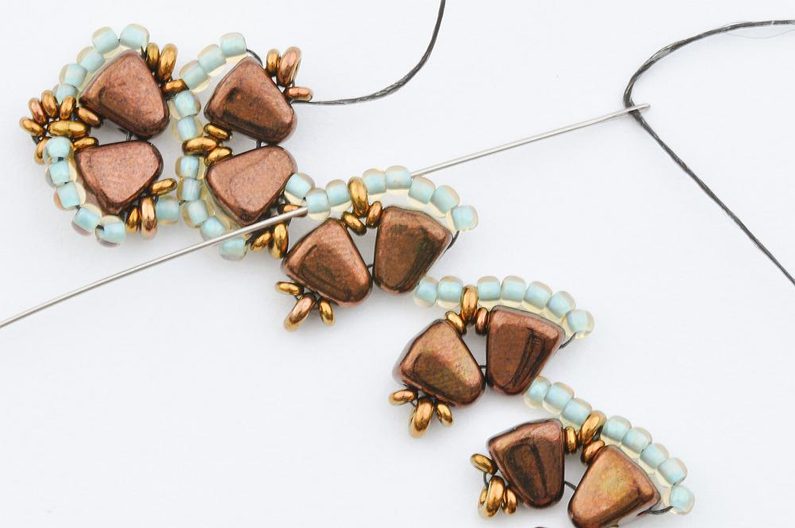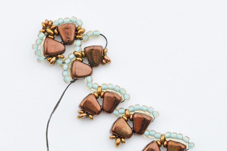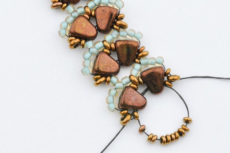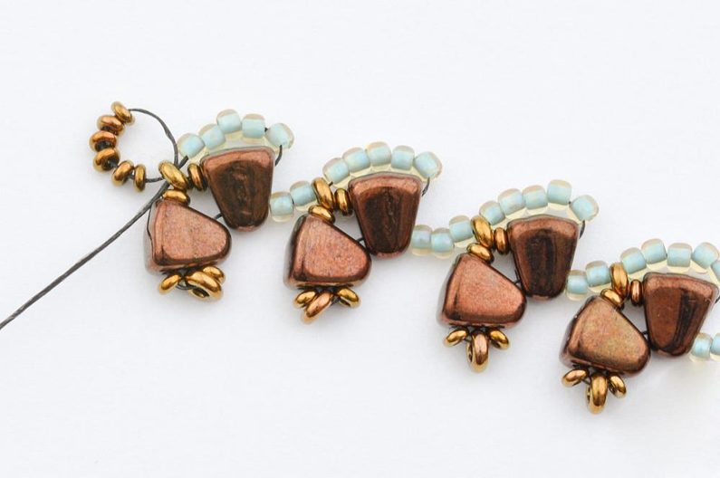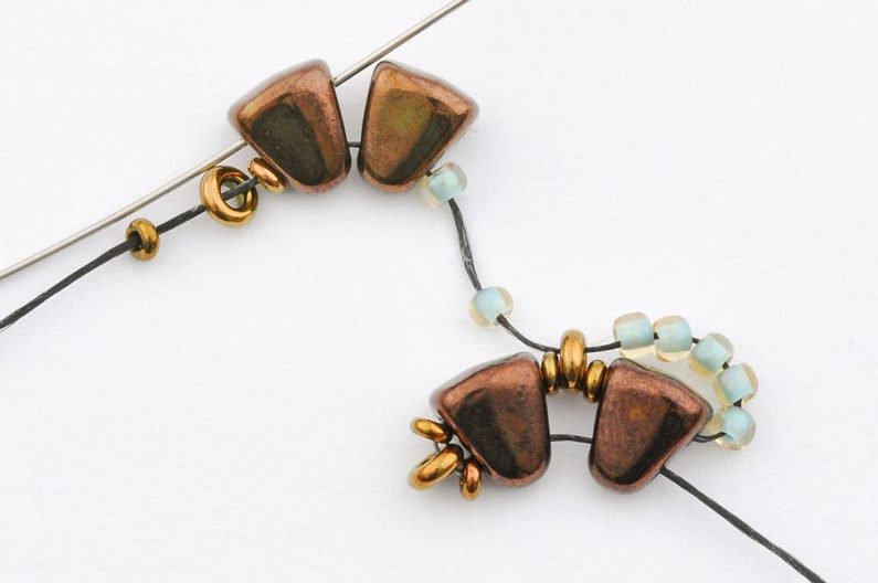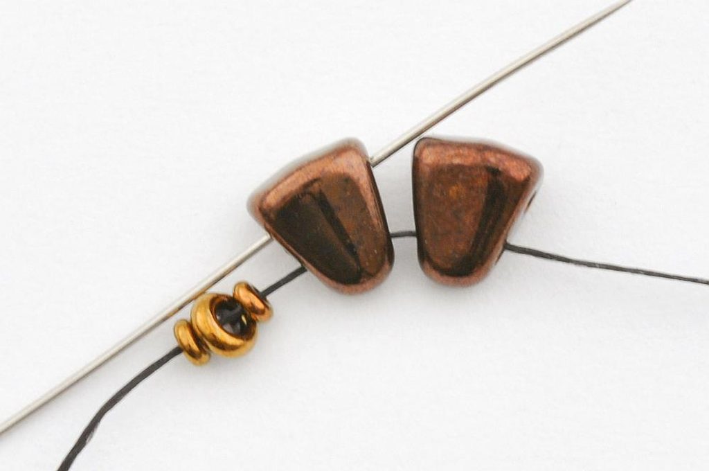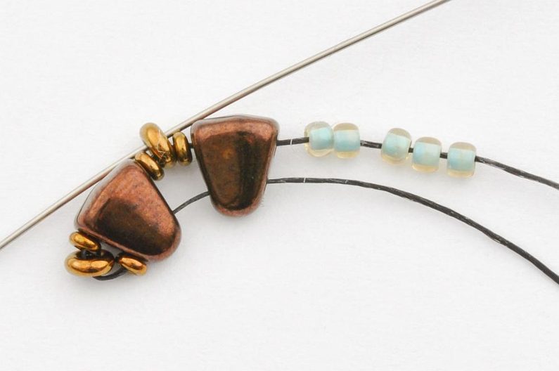 Navlečte 10 rokajlů TOHO Demi Round velikost 11 a provlečte oba korálky MATUBO Nib-bit v jejich užší části, aby vzniklo očko.
