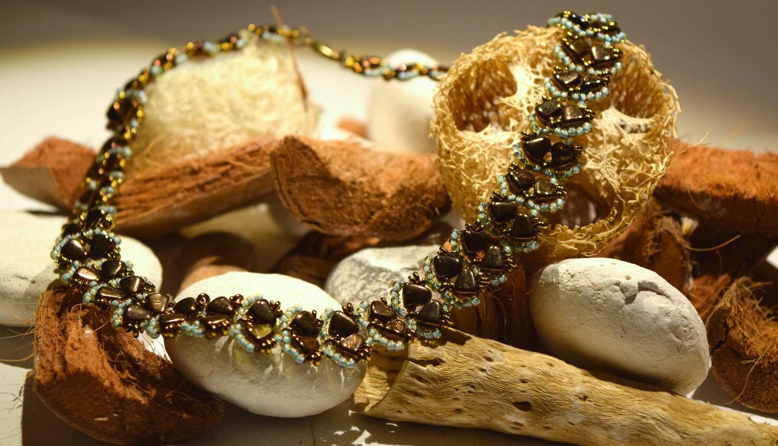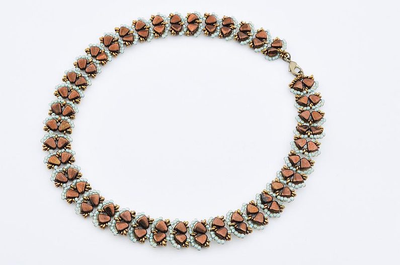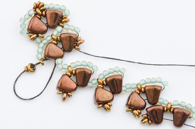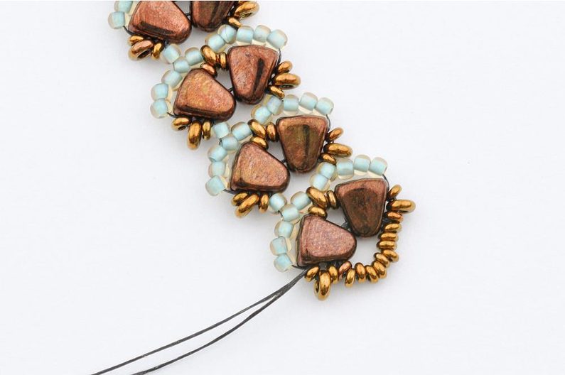 Tip: Tím, že na začátku budete střídat dva rokajly TOHO Round se třemi a při vracení se zpátky budete jednou jeden rokajl TOHO Round přidávat a jednou vynechávat, bude se náhrdelník tvarovat a stáčet k jedné straně. Pokud byste chtěli udělat náhrdelník delší, střídejte ze začátku rokajly v rytmu 2-2-3 a při vracení v rytmu 1-0-0. Náhrdelník se nebude tolik kroutit. Tento steh lze použít i při šití náramku. V tomto případě potom počty korálků neměňte. Ze začátku přidávejte vždy po dvou rokajlech a při vracení se žádný nepřidávejte.
