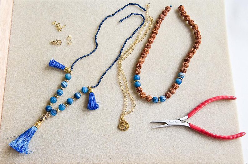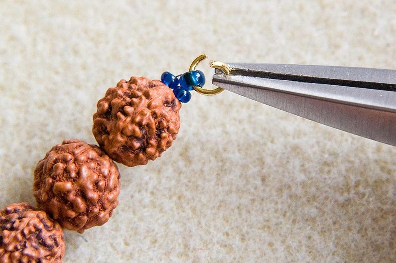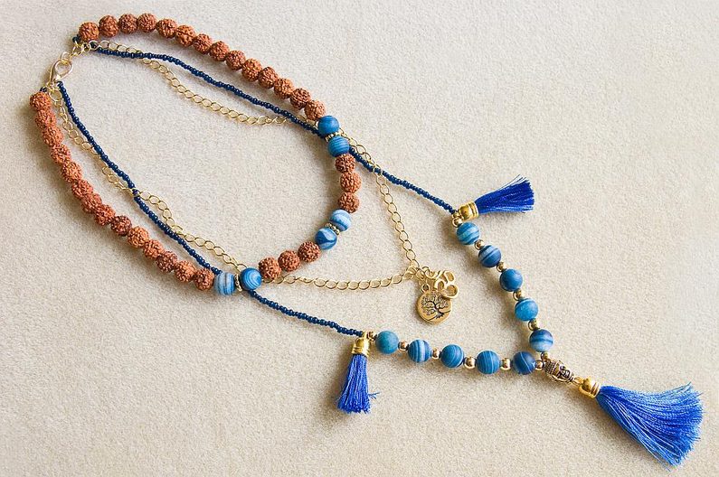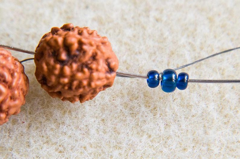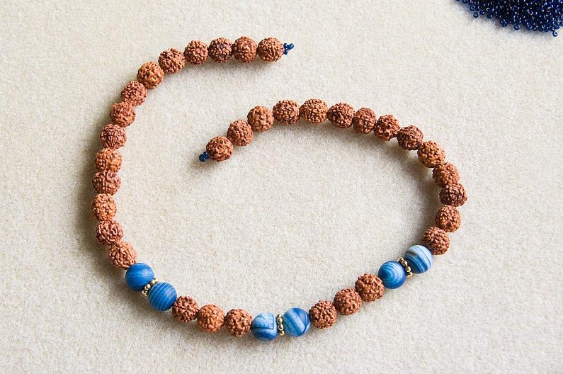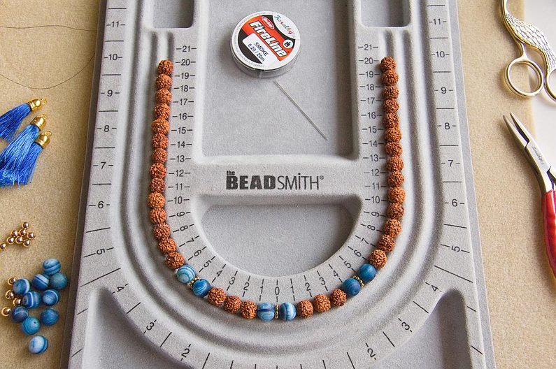Náhrdelník bude mít tři "vrstvy". Začneme první, nejkratší šňůrou. Nakombinujeme si rudraksha a minerálové korálky. Pokud máte vzorovací podložku, půjde vám příprava lépe, uvidíte hned, jak dlouhá bude šňůra a korálky v drážkách pěkně sedí. Já jsem si RK proložila dvojicemi MK, mezi které jsem ještě vložila TierraCast ozdobné mezidíly a moje šňůra je cca 40cm dlouhá (obr.1).