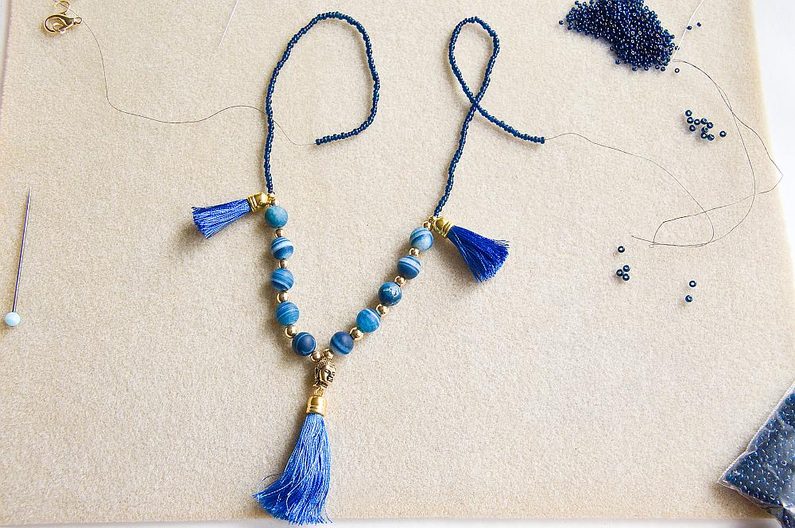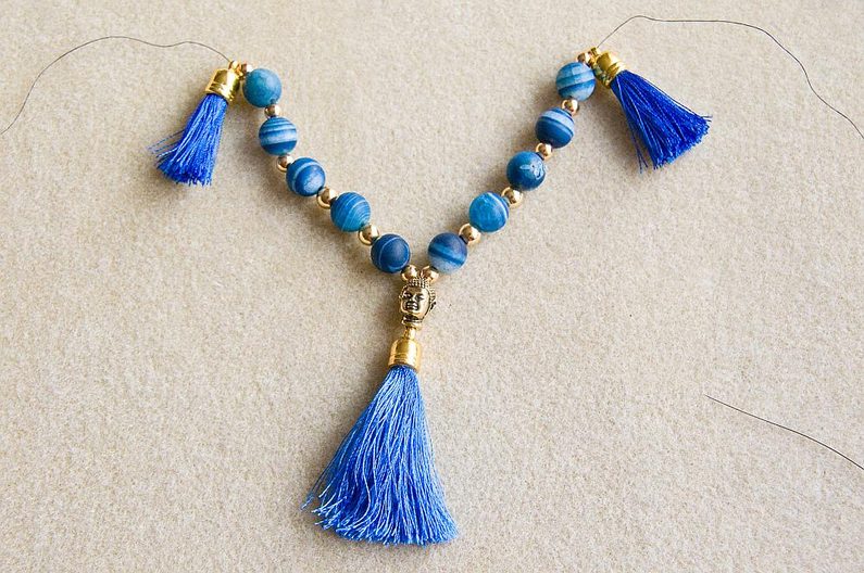 Poslední šňůra bude opět navlékaná. Na vzorovací podložku si připravíme MK a kovové korálky. Kombinaci si můžete upravit podle své fantazie. Já jsem si poskládala od středu na každou stranu vždy 1x KM5, 1x MK, 1x KM6, 1x MK, 1x KM6, 1x MK, 1x KM5, 1x MK, 1x KM5, 1x MK, 1x KM5. Z každé strany si připravíme malý střapec a uprostřed bude TierraCast korálek - hlavička Buddhy a velký střapec (Obr.10). Ustřihneme si cca 1,5m nitě. Připravené korálky a komponenty si navlékneme. Buddhovu hlavu provlékneme shora, pak provlékneme očko střapce, znovu provlékneme Buddhovu hlavu tentokrát zespodu a můžeme pokračovat v navlékání korálků (Obr.11). Na každou stranu navlékneme 1x PR8 a dál navlékáme směs PR8 a PR10 (Obr.12). Navlékneme cca 20cm směsi, aby celková délka kolem krku třetí šňůry byla cca 55cm nebo podle potřeby (Obr.13).