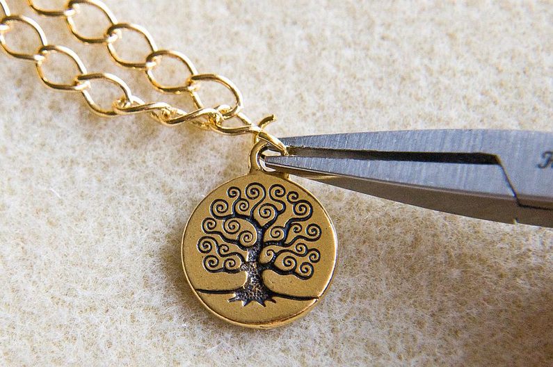 Připravíme druhou "vrstvu" náhrdelníku. Z metráže si odměříme cca 45cm řetízku a štípacími kleštěmi odštípneme. Délku si přizpůsobte, počítejte řetízek cca o 5cm delší než je první šňůra (Obr.7). Najdeme si prostřední očko řetízku. Plochými ketlovacími kleštěmi si otevřeme spojovací kroužek 5mm, do kterého vložíme prostřední očko a přívěsek TierraCast (Obr.8). Kleštěmi uzavřeme. Zavěsíme i další přívěsek (Obr.9).