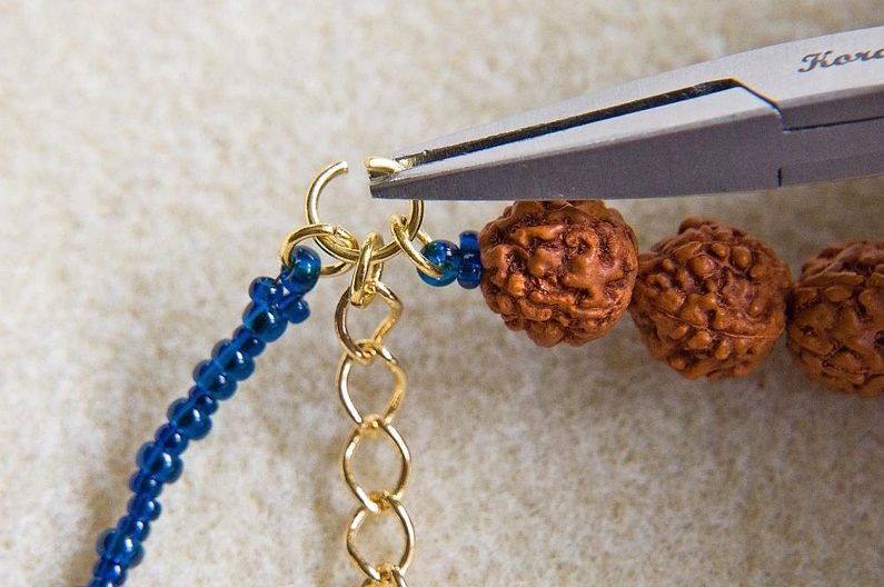 Malým kroužkem spojíme velký kroužek s karabinkou na jedné straně a kroužkem zapínání na druhé straně (Obr. 21). Velký vrstvený a nepřehlédnutelný náhrdelník v boho stylu je hotový (Obr. 22).