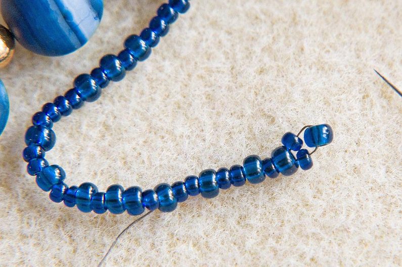 Pokud jsme spokojení s navlečenou délkou, stáhneme korálky cca 10cm od konce niti. Navlékneme 1x PR8 a provlékneme se zpět všemi korálky až na druhý konec (Obr.14). Navlékneme opět 1x PR10, 1x PR8, 1x PR10 a svážeme obě nitě několika uzlíky (Obr.15). Konce nití provlékneme kousek zpět řadou korálků a odstřihneme. Máme připraveny všechny řady a můžeme je spojit dohromady (Obr.16).