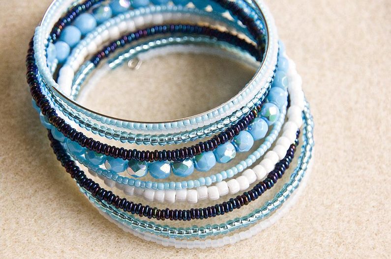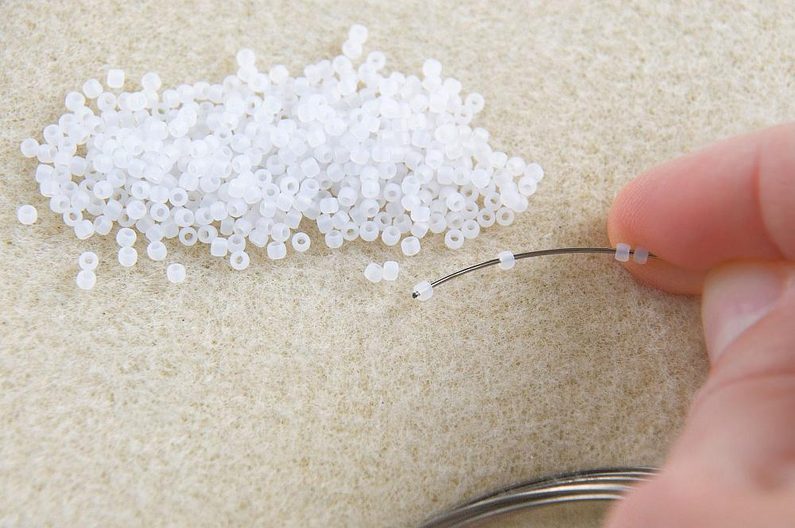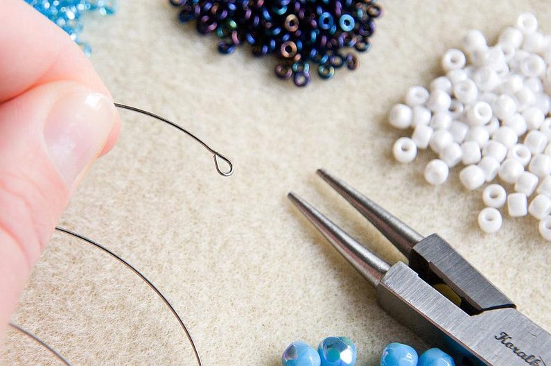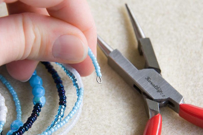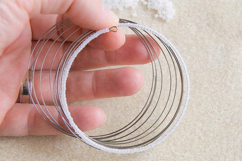 Připravíme si 10 otáček paměťového drátu a paletu korálků, které budeme navlékat. Na jednom konci paměťového drátu uděláme ketlovacími kleštěmi malé očko, o které se navlékané korálky zastaví.