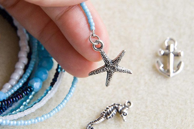 Konec paměťového drátu opět uzavřeme očkem pomocí ketlovacích kleští. Na náramek rozmístíme přívěsky TierraCast. Vybrat si můžete z mnoha motivů. Pro tento náramek jsem zvolila přívěsky v námořnicko-mořském stylu.