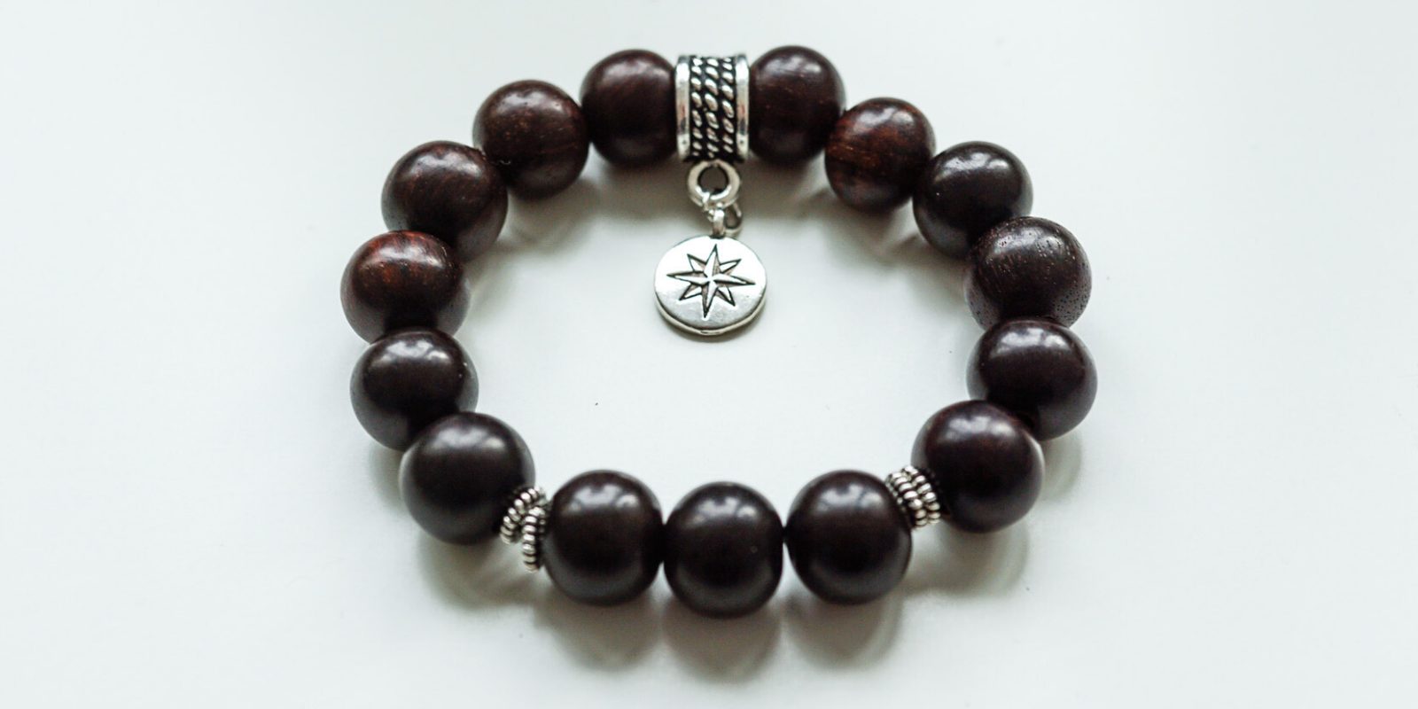 Začneme navlékat ebenové korálky a mezidíly TierraCast. Jakmile dojdeme na konec navlékneme TierraCast korálek s ověsem, na který zavěsíme pomocí spojovacího kroužku TierraCast přívěsek.