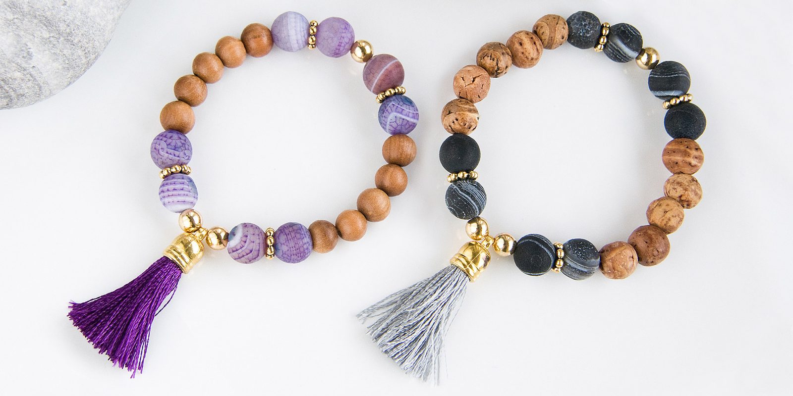 Utáhneme a důkladně svážeme, konce pruženky odstřihneme. Mezi korálky se uzlík dobře schová. Náramek je hotový.