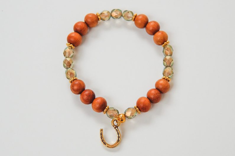 Poté stačí navlékat korálky ze dřeva a broušené korálky a stříbrné komponenty dle obrázkového vzoru. A na distanční kroužek poté připojíme pomocí kleští stříbrný přívěsek.