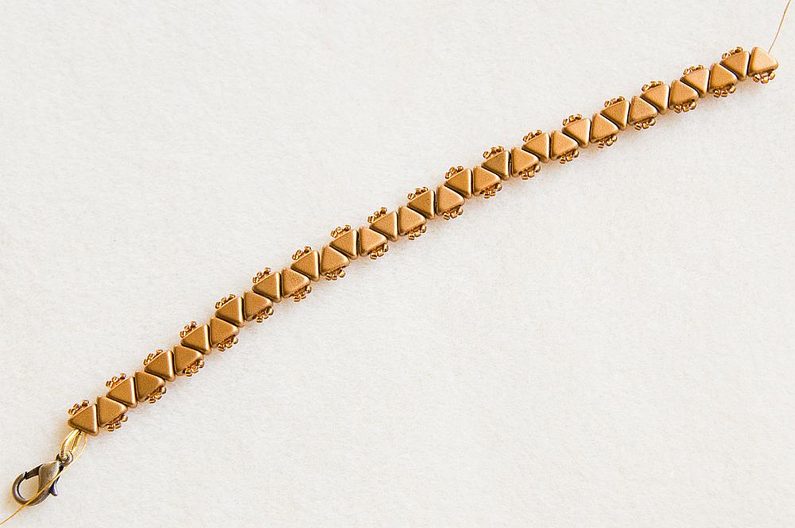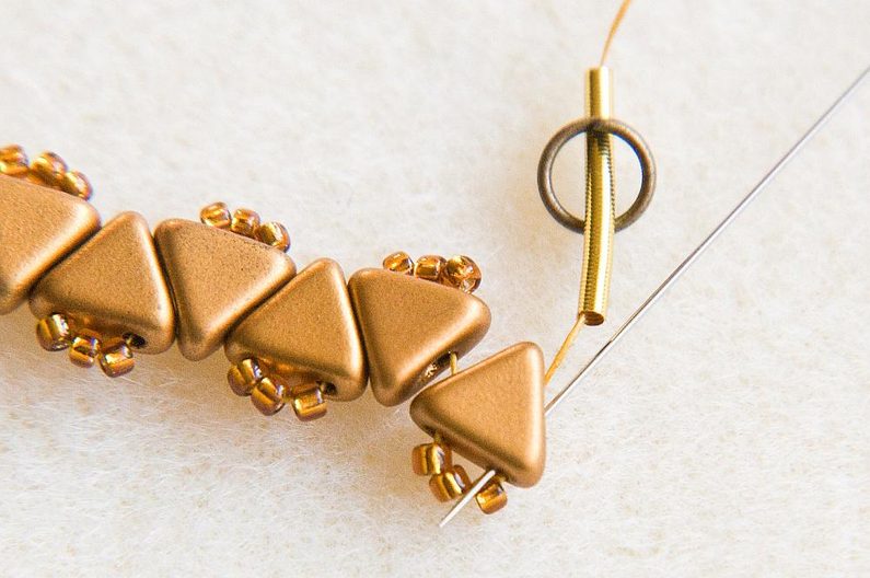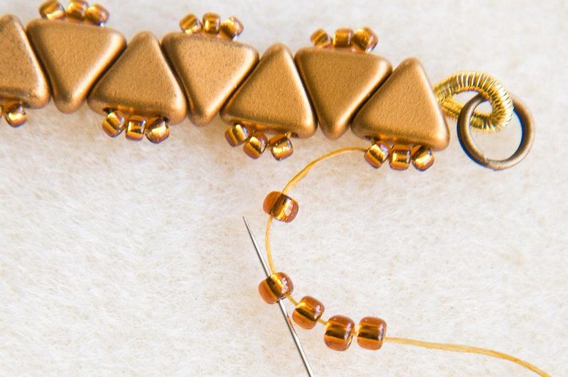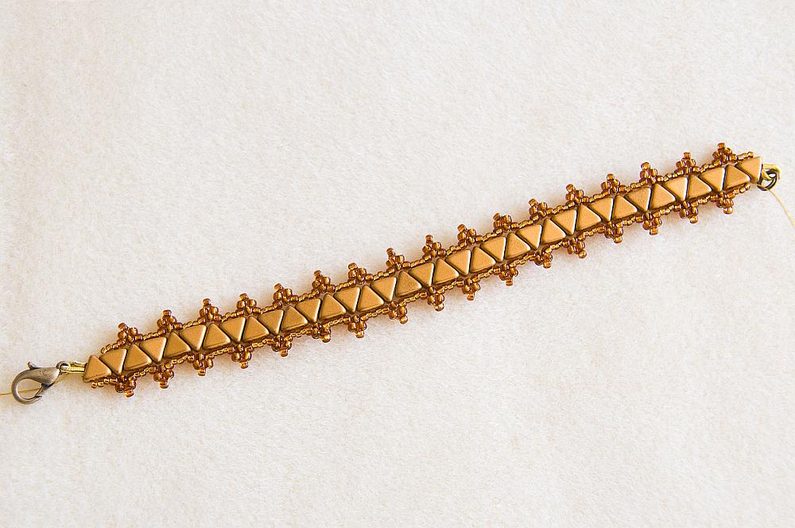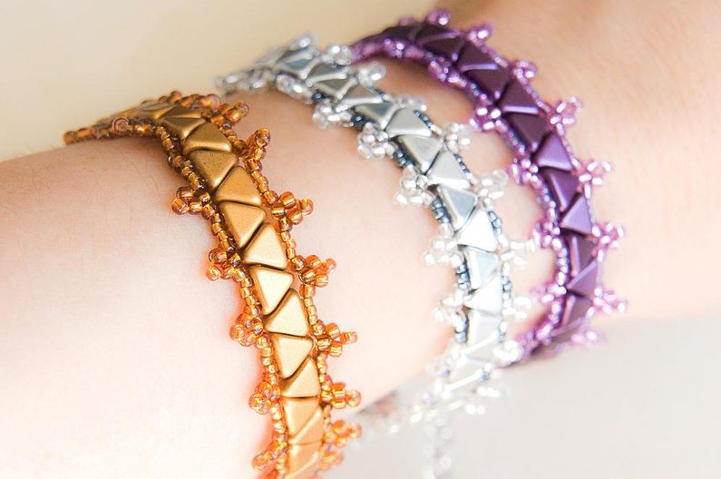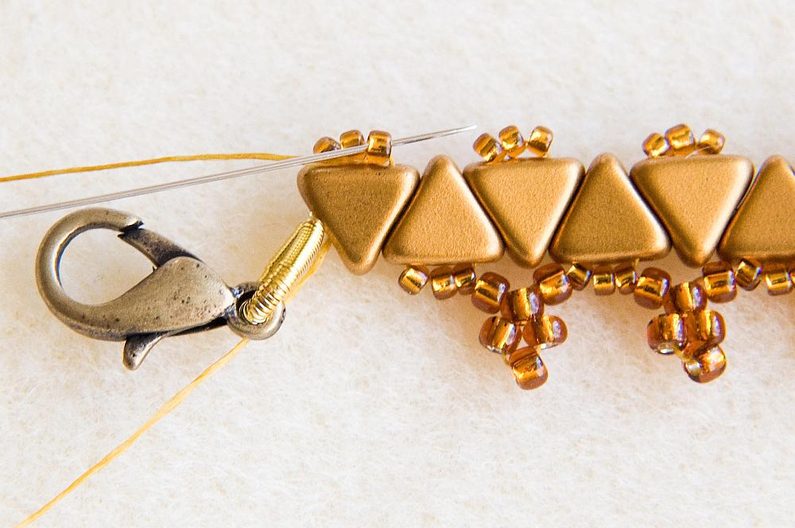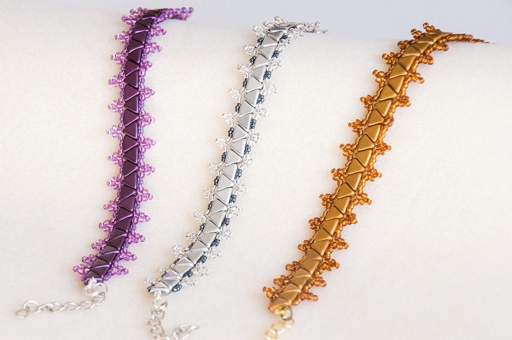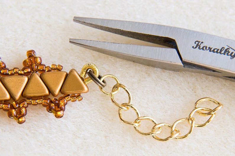 Takto prošijeme celou jednu stranu. Na konci se prošijeme skrz KP na druhou stranu a opakujeme celý Krok 6 i na druhé straně. Pozn. Korálky TR15 prošíváme již potřetí, proto pokud by vám to šlo ztuha, použijte jehlu vel.12, která je tenčí. Když máme ušité obě strany, konce nití zapošijeme, tj. prošíváme korálky dál, dokud není nit krátká, a pak konec niti odstřihneme. (Obr.23) Podle potřeby můžeme nastavit délku náramku adjustačním řetízkem. Oddělíme si z řetězoviny cca 3cm a spojovacím kroužkem ji připevníme ke kroužku zapínání, plochými ketlovacími kleštěmi kroužek zavřeme. (Obr.24) Náramek je hotový, můžeme si ušít další barevné varianty. (Obr.25-27)