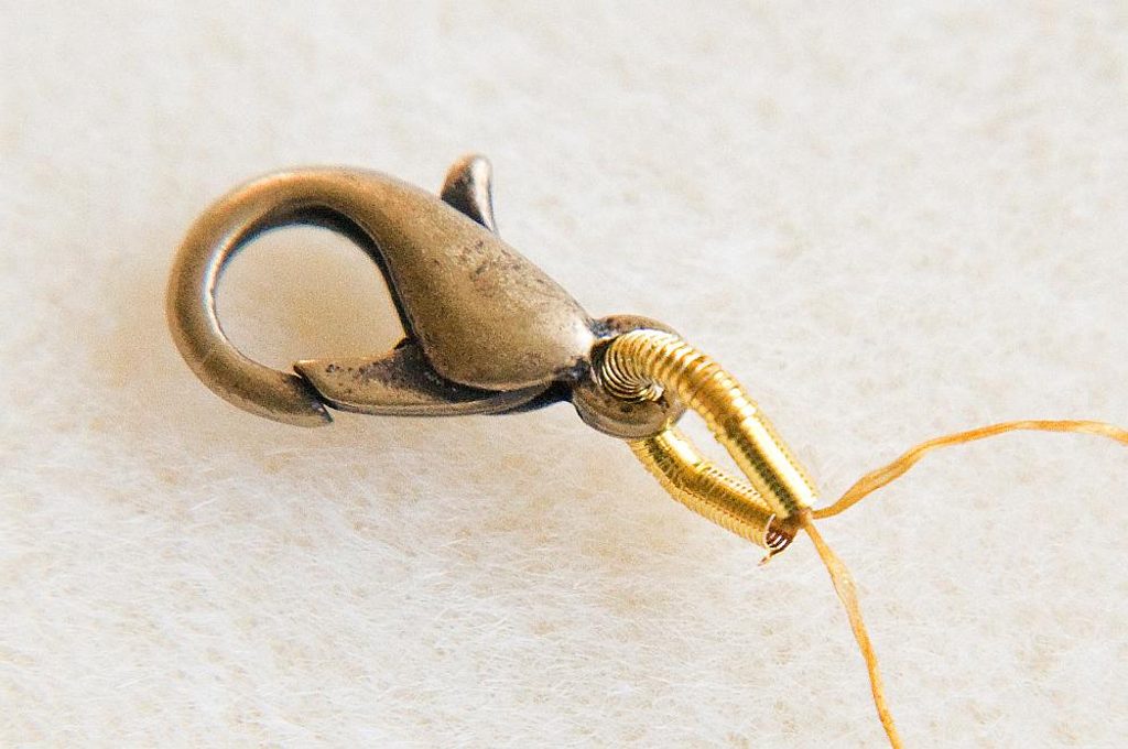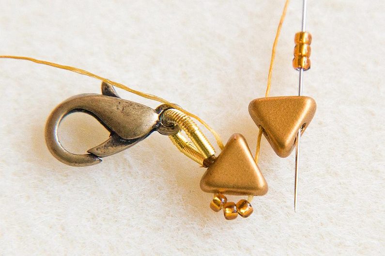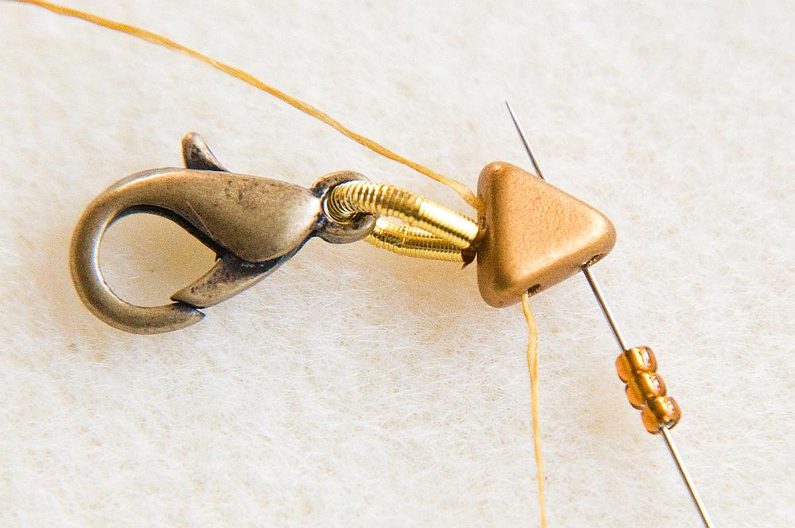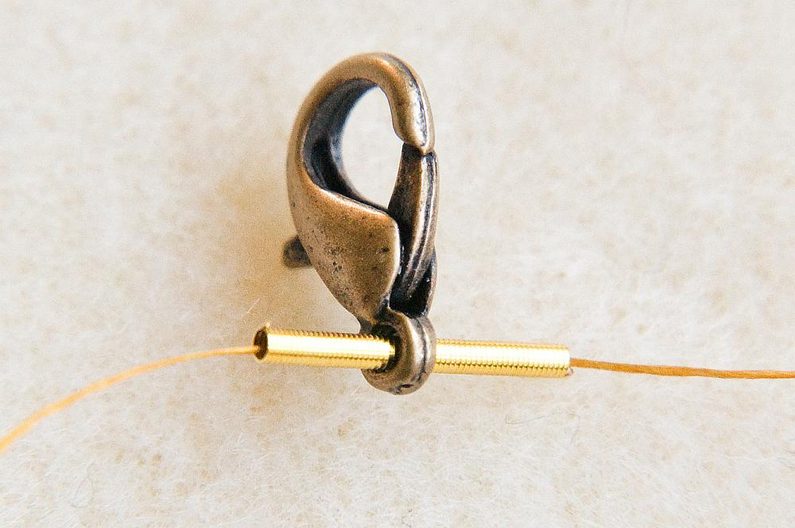 Na nit dlouhou cca 2m (pokud nechcete manipulovat s tak dlouhou nití, lze během šití navázat) navlékneme 1cm French wire a karabinku. (Obr.1) Svážeme uzlíkem. (Obr.2)