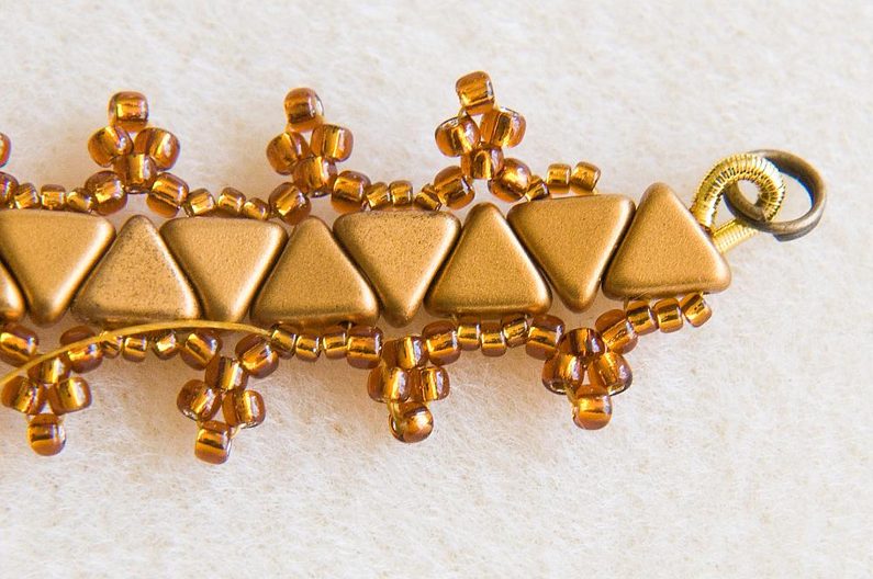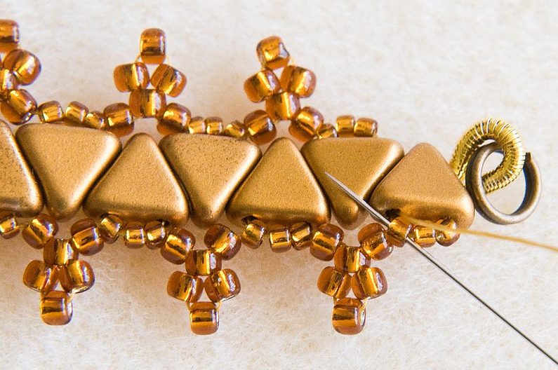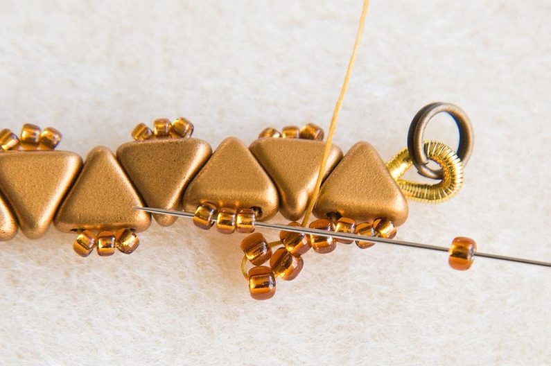 Provlékneme následující 3 TR15. (Obr.10) Navlékneme 5 TR11 a provlékneme druhý z navlečených korálků směrem proti niti, která z něj vychází. (Obr.11) Utáhneme a vznikne nám malá špička. (Obr.12) Navlékneme 1 TR11 a provlékneme následující 3 TR15. (Obr.13) Utáhneme. Tento krok opakujeme po celé straně náramku. Hlídejte si, aby trojúhelníčky do sebe stále zapadaly "cikcak". (Obr.14)