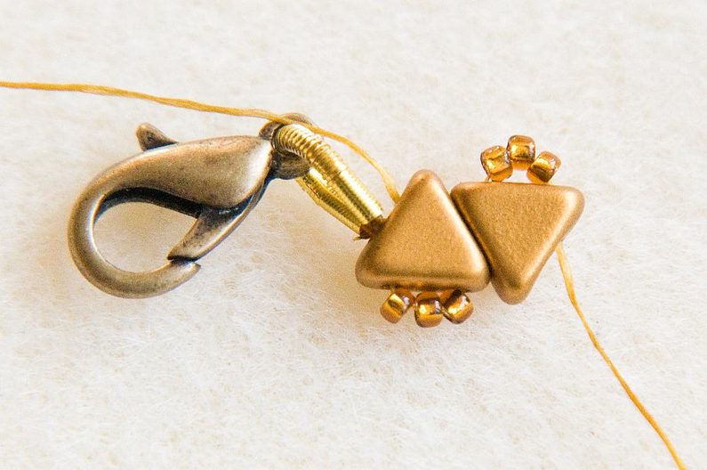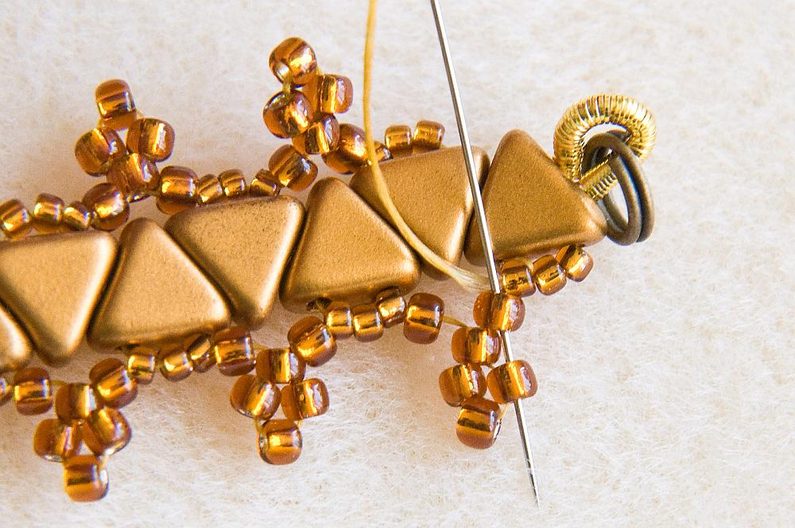 Až došijeme na konec druhé strany, prošijeme se znovu skrz obě KP na první stranu. (Obr.18) Prošijeme ještě i krajní TR15. (Obr.19) Nyní musíme zafixovat "špičky" korálkových trojúhelníčků - prošijeme první TR11, prostřední TR11 vynecháme a prošijeme následující TR11. (Obr.20) Prošijeme celou špičku, opět prostřední TR11 vynecháme a prošijeme následující TR11 i tři další TR15. (Obr.21) Utahujeme, aby vznikly trojúhelníčky. (Obr.22)