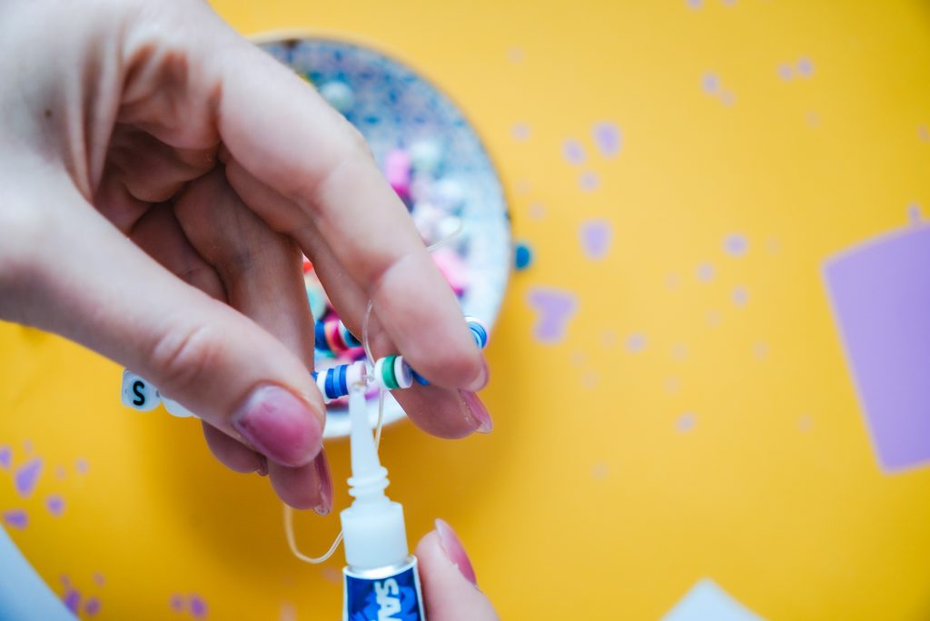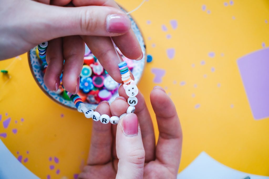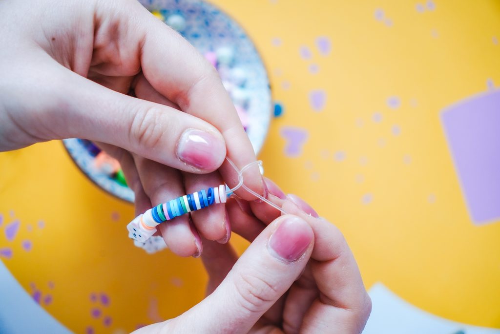 • Změříme si obvod ruky a ustříhneme si elastomer o cca 10 cm delší. Navlékáme heishi korálky, které kombinujeme s korálky s různými motivy a smajlíky. Nezapomeňte pomocí korálků s písmenky vytvořit na náramku název oblíbených skladem Taylor Swift nebo jména vašich nejlepších přátel.