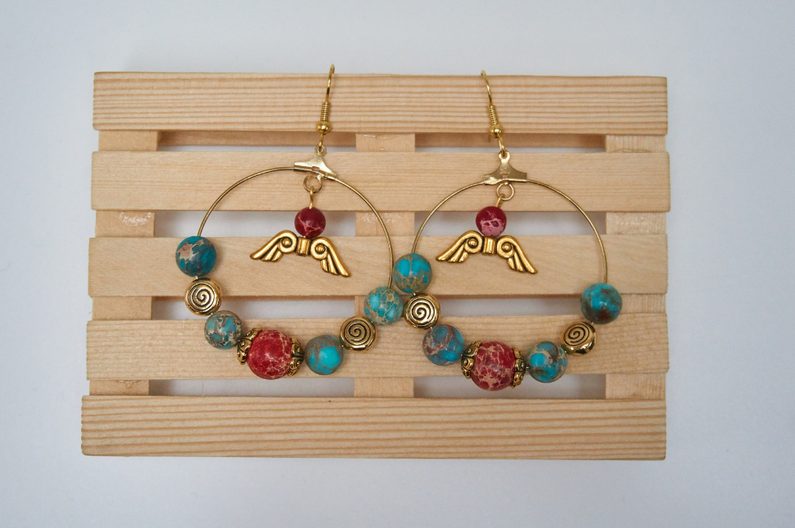 Nejprve si na ketlovací nýtovou jehlu navlékneme ozdobná křídla a minerálový korálek.
