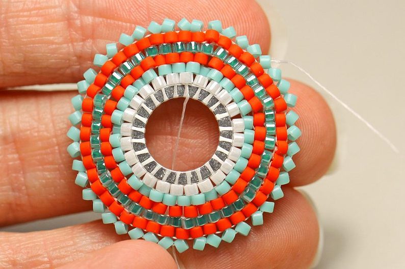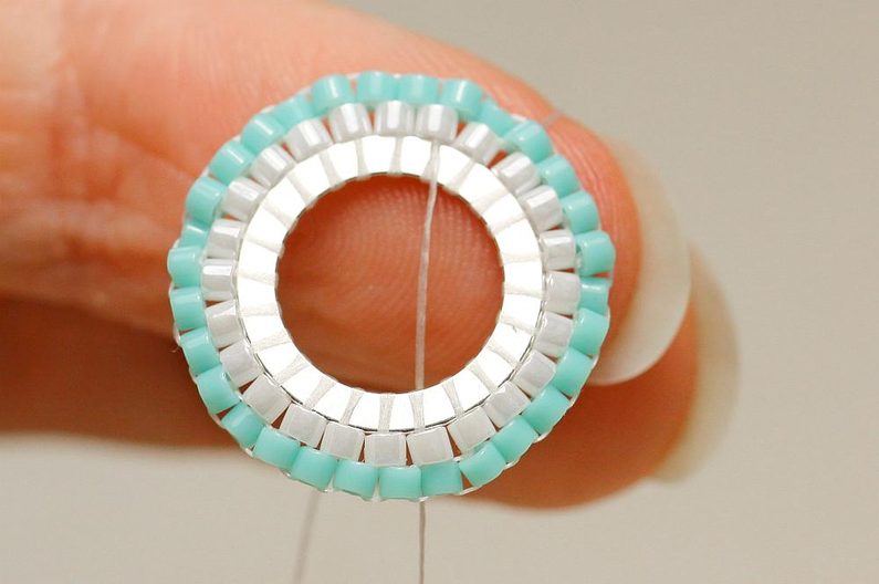 Opakujeme dokola, až máme hotovou celou řadu – celkem by to mělo být 24 korálků. Poslední korálek spojíme se začátkem řady protažením shora, jehlu pak vedeme druhým korálkem zespodu nahoru, aby jehla vycházela nahoře, vně obšívaný kroužek.