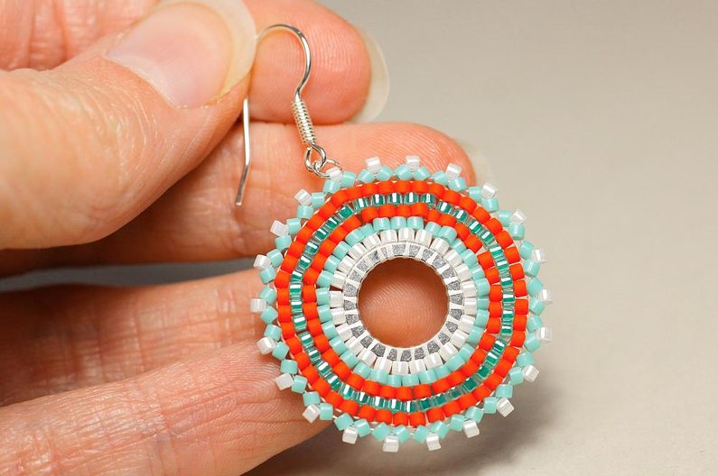 Do jednoho z korálků poslední řady navlékneme spojovací kroužek a háček. Teď již zbývá trpělivost na dokončení druhé náušnice. :)