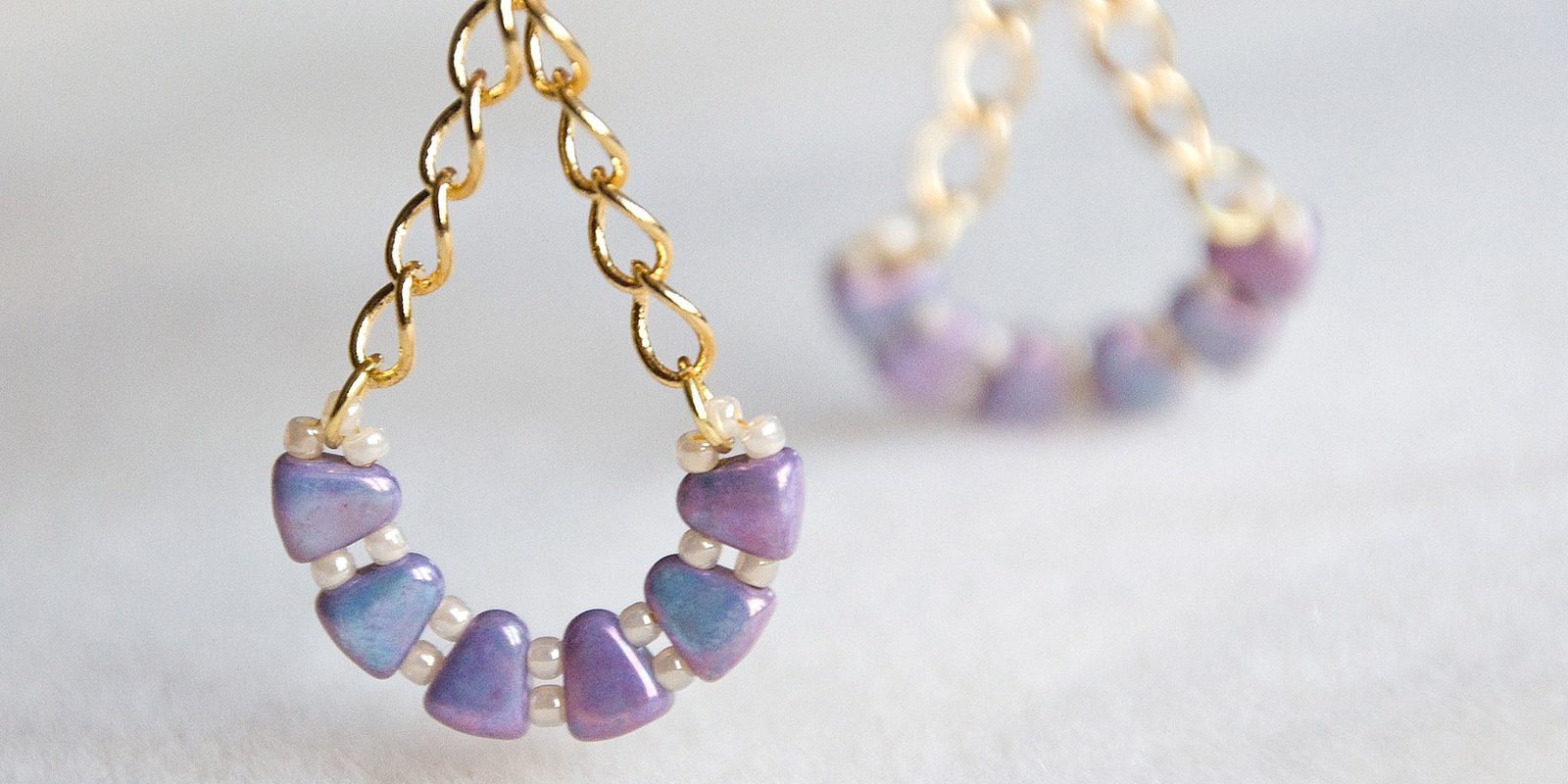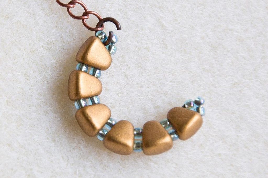 Plochými kleštěmi si do strany otevřeme očko náušnicového háčku a navlékneme ho do očka uprostřed řetízku (Obr. 8). Očko háčku uzavřeme a máme hotovo. Ušijeme i druhou náušnici (Obr. 9-10).