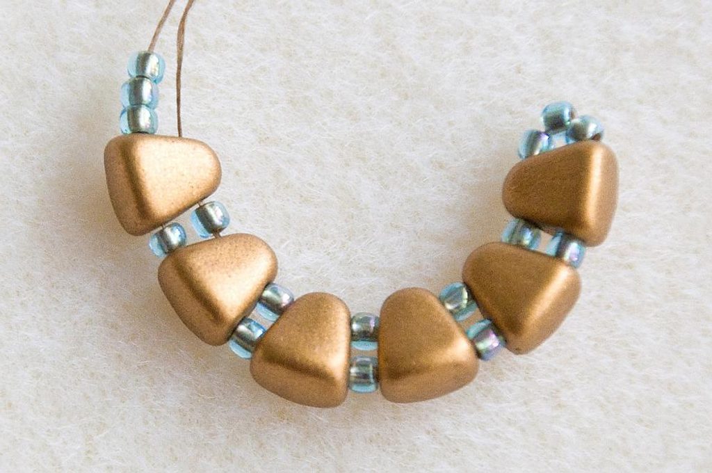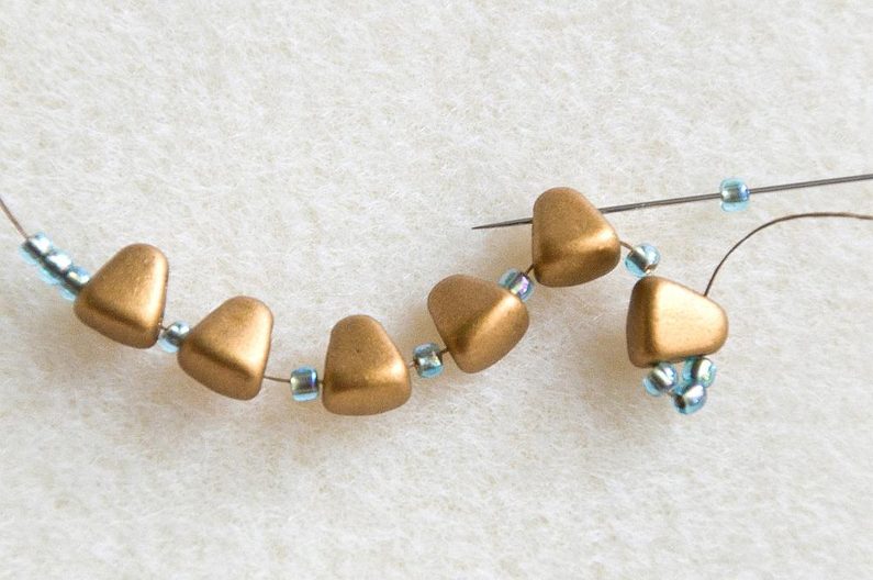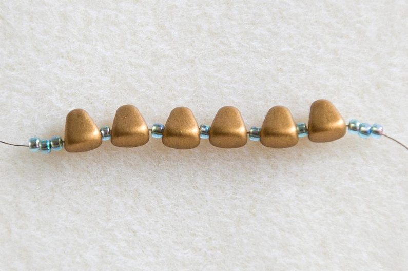 Na nit dlouhou cca 40 cm navlékneme 3× TR11, dále střídavě MNB a TR11 (6× MNB a 5× TR11) a na konci bude opět 3× TR11 (Obr. 1). Provlékneme skrz volnou dírku posledního MNB a nyní navlékáme 1× TR11 a provlékáme volnou dírku následujícího MNB (Obr. 2). Takto navlékneme celou délku obloučku (Obr. 3). Oba konce niti pevně svážeme uzlíkem, opravdu dobře utáhneme, aby se zpevnil celý oblouček. Konce niti provlékneme skrz řadu korálků a ustřihneme (Obr. 4).
