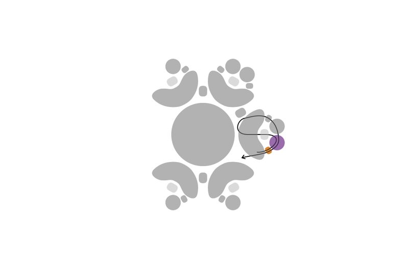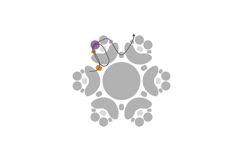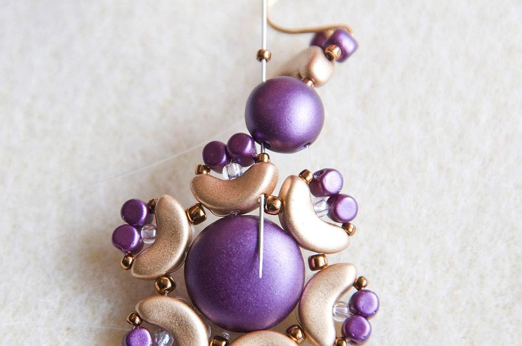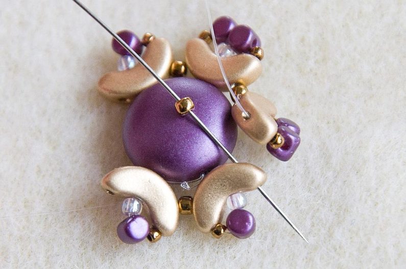 Navlékneme 1 TE11 a provlékneme krajní dírku vedlejšího A. Navlékneme 1 TE15, 1 M a prošijeme TR11, A prostřední dírkou, znovu levou dírku A, TE15, oba korálky M, TE15, A, spojovací TE11, krajní dírku
