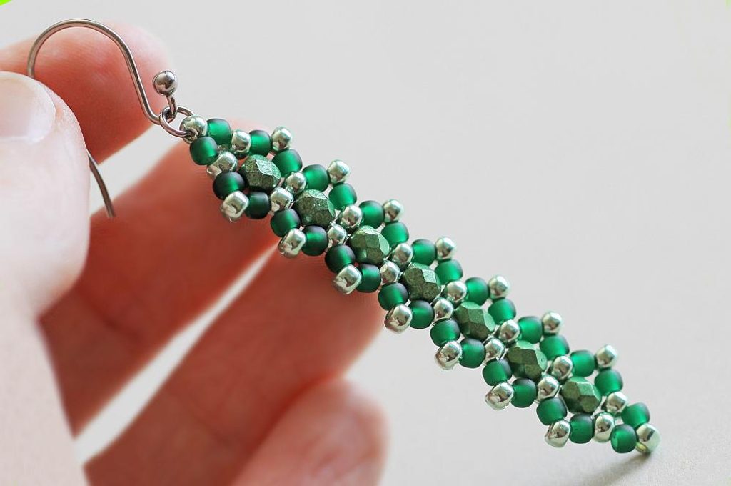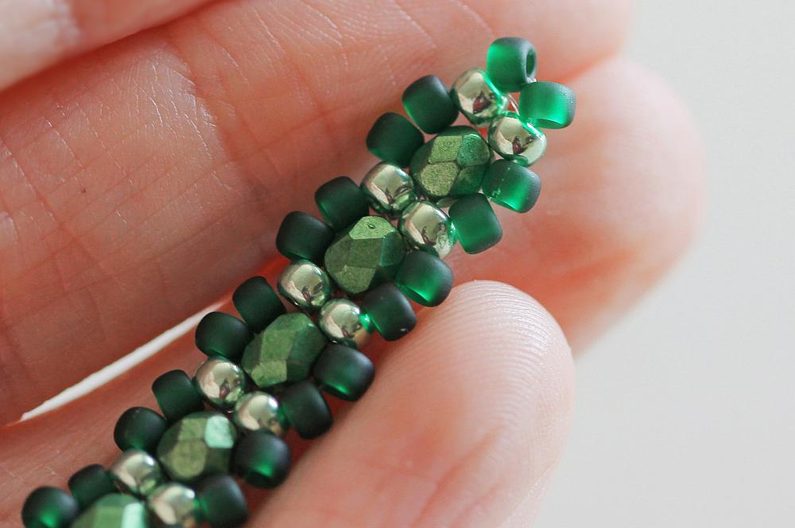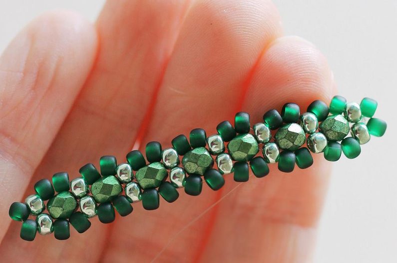 Opakujeme po celém obvodu náušnice. Dva tmavě zelené TR8 všíváme i do obou špiček mezi mátové TR8.