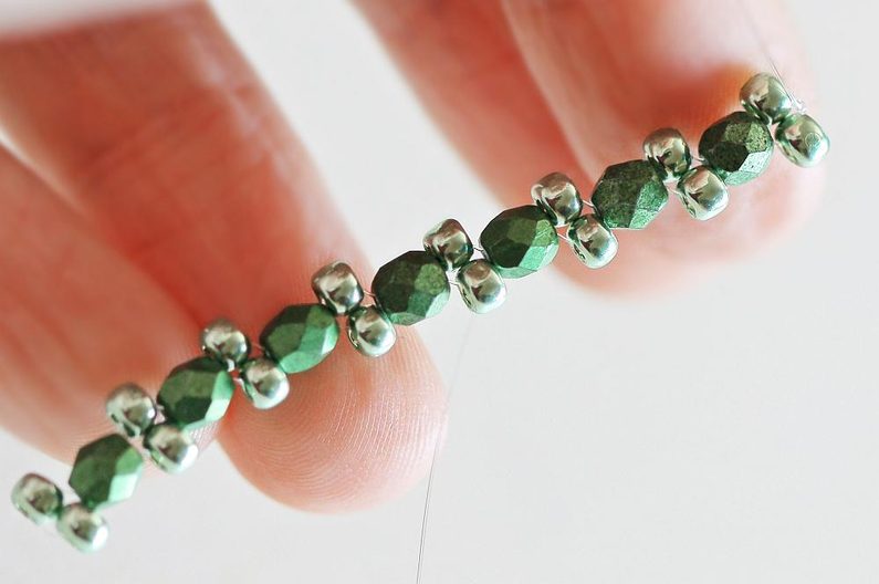 Ustřihneme si přibližně 1 metr vlasce. Navlékneme na jehlu a na vlasec navlékneme BK4 a mátové TR8 v tomto pořadí: 1× TR8, 1× BK4, 1× TR8, 1× BK4, 1× TR8, 1× BK4, 1× TR8, 1× BK4, 1× TR8, 1× BK4, 1× TR8, 1× BK4, 1× TR8, 1× BK4, 2× TR8.