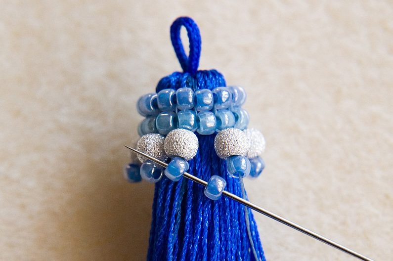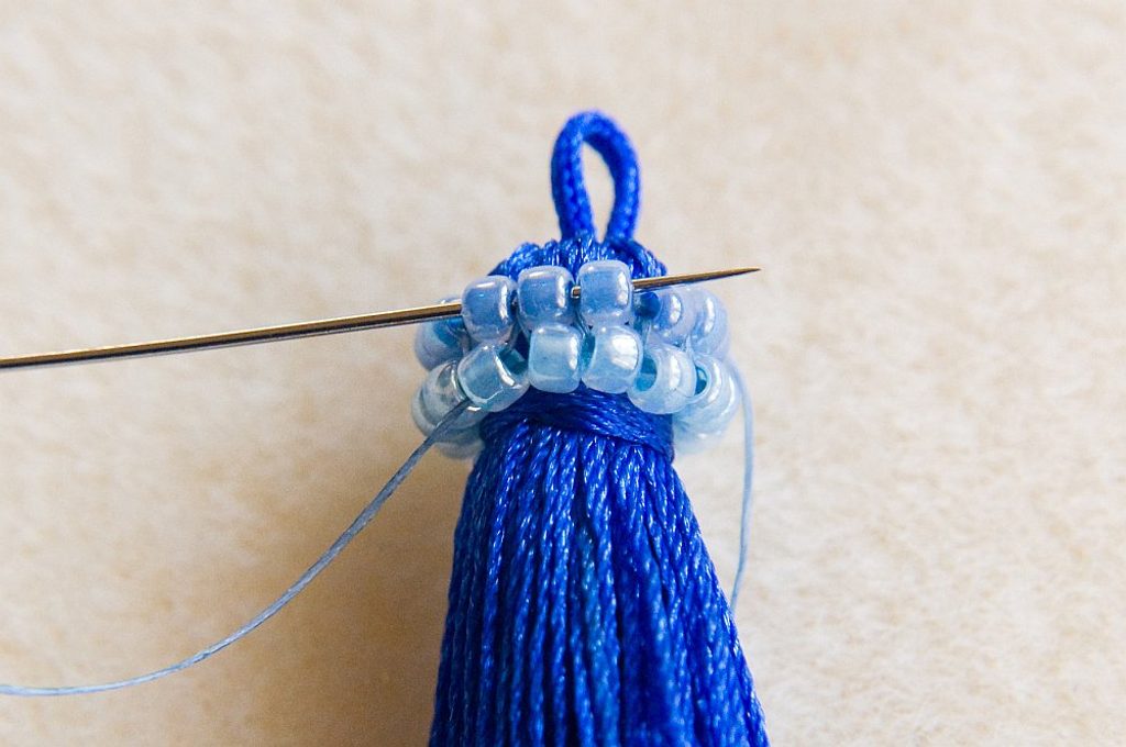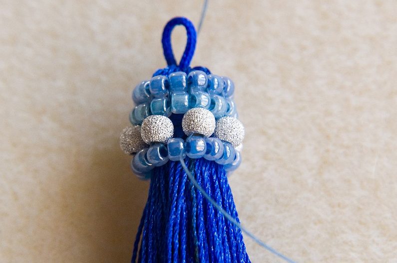 Na nit dlouhou cca 0,75cm si navlékneme jehlu a 14x TR11a (nebo počet podle tloušťky střapce), obepneme střapec a uděláme uzlík (Obr.1).