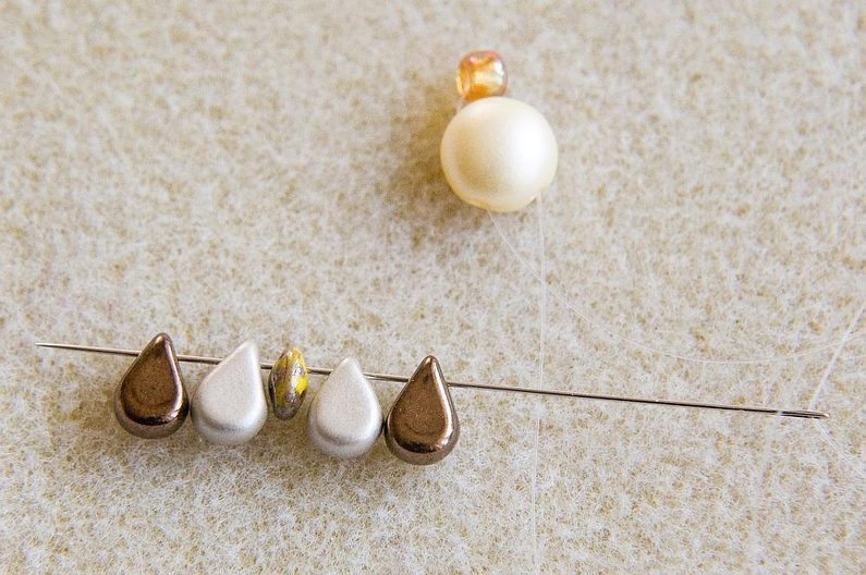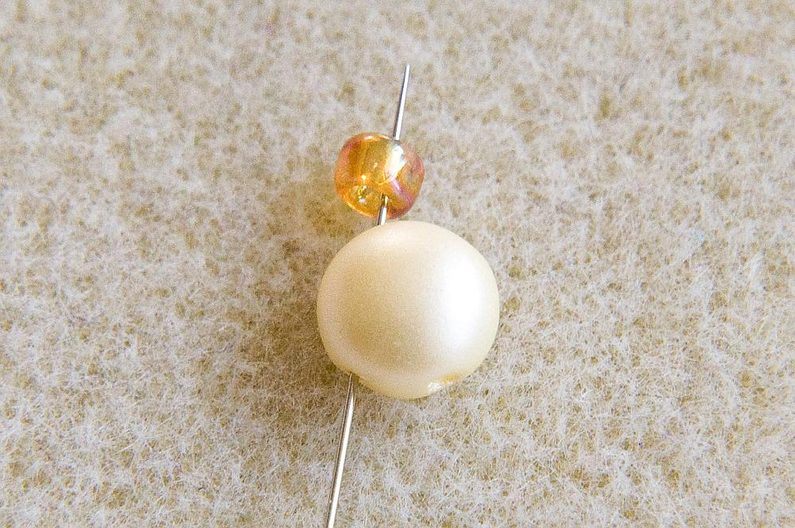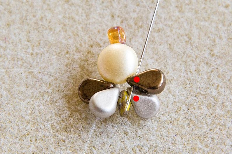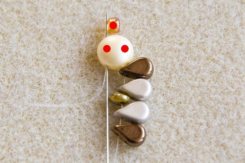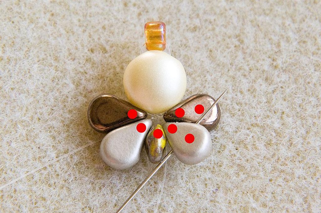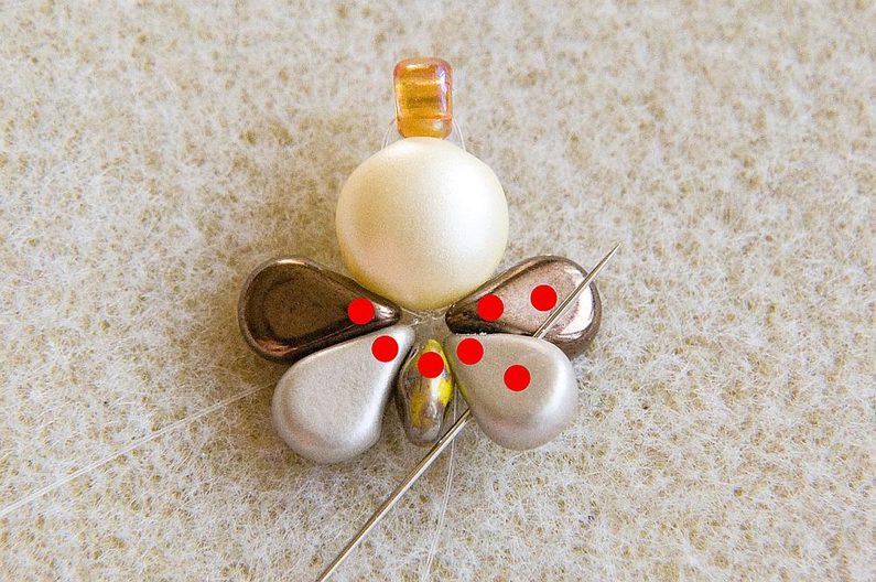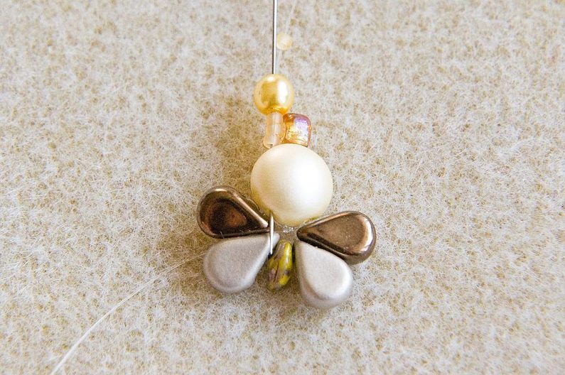 Na vlasec dlouhý cca 0,5 m navlékneme 1× PC8 levou dírkou (vypouklé „bříško“ je směrem nahoru) a 1× TR6. Korálky stáhneme cca 10 cm od konce vlasce (Obr. 1). Provlékneme pravou volnou dírku PC8 (Obr. 2). Navlékneme 1× AmP1 a 1× AmP2 (obě užší dírkou), 1× MS, 1× AmP2 a 1 AmP1 (obě užší dírkou; Obr. 3). Provlékneme ještě jednou levou dírku PC8, TR6 a pravou dírku PC8 (Obr. 4). Utáhneme a svážeme oba konce vlasce pod PC8 (Obr. 5).
