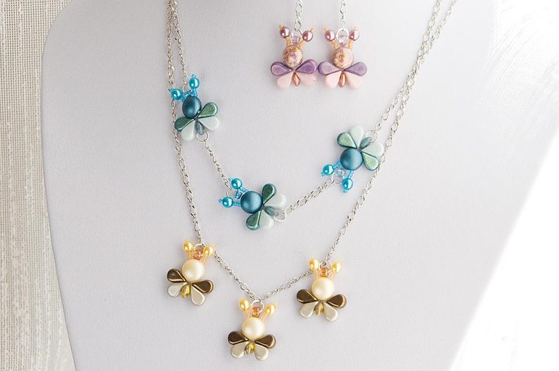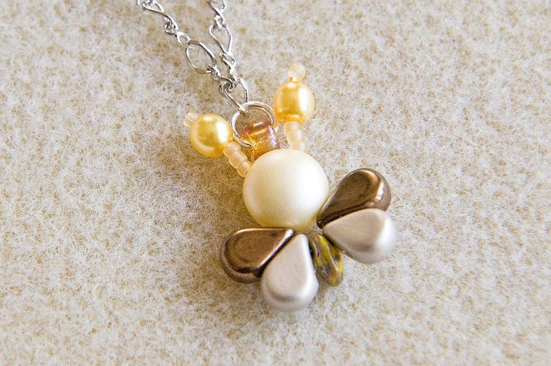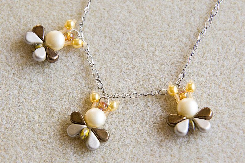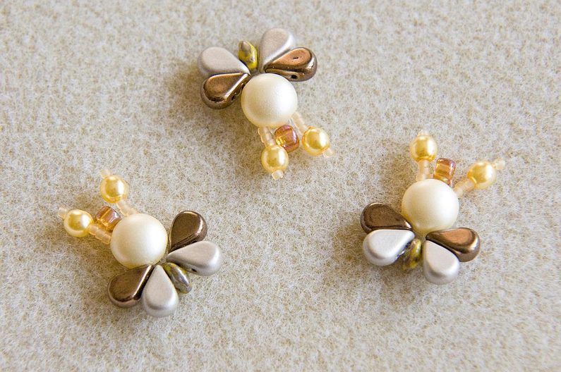 Stejným postupem (Krok 1 – Krok 3) si ušijeme další dvě včeličky (Obr. 15). Spojovací kroužek provlékneme skrz TR6 a vložíme do něj i očko uprostřed řetízku. Plochými kleštěmi kroužek uzavřeme (Obr. 16). Takto zavěsíme i další včeličky přibližně 2 cm od sebe (Obr. 17). Některá Matubo Superdua jsou průchozí pro spojovací kroužky (záleží na povrchové úpravě MS a na tloušťce kroužku), proto můžete zkusit zapojit včeličky do řetízku za sebe: řetízek si rozdělíme štípacími kleštěmi a spojovací kroužek provlékneme skrz volnou dírku MS (v „zadečku“ včeličky; Obr. 18). Máme hotovo a včeličky mohou vylétnout. :) Kromě řetízku si můžete vyrobit jednoduché včeličkové náušnice či náramek (Obr. 19).