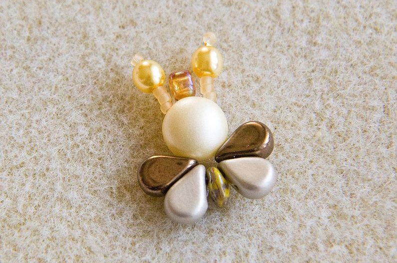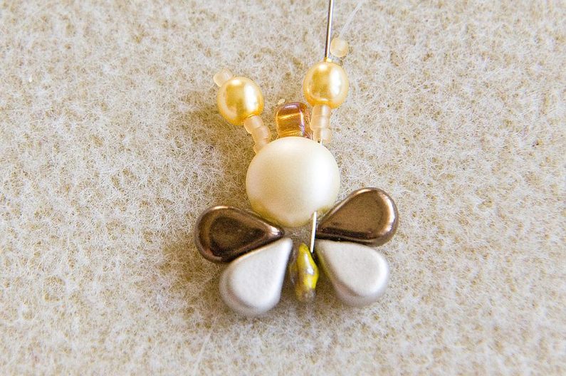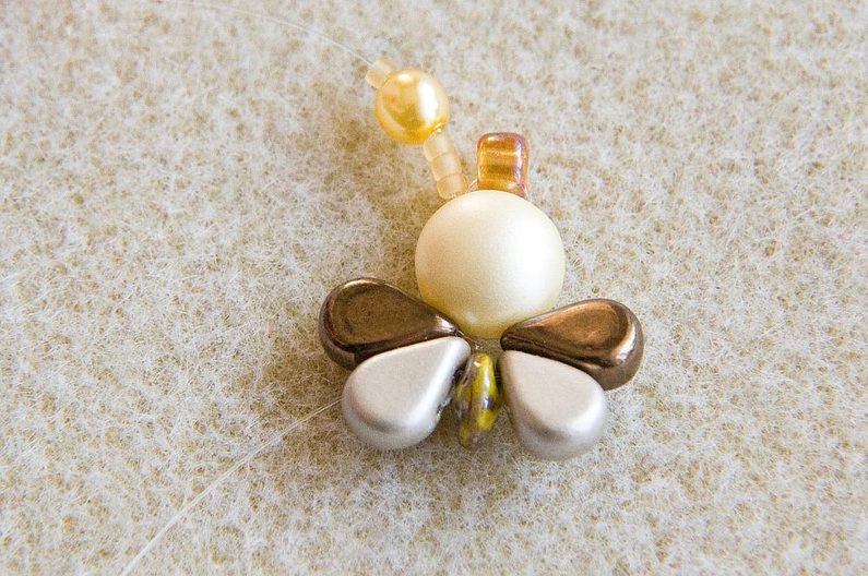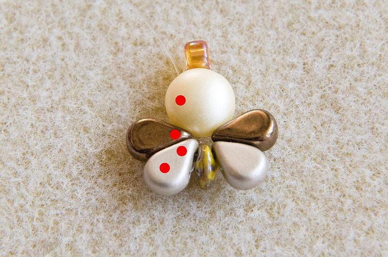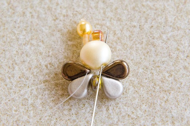 Navlékneme 3× TR15, 1× VP4 a 1× TR15 (Obr. 10). Provlékneme znovu VP4, všechny TR15 a PC8 (Obr. 11). Provlékneme PC8 druhou (pravou) dírkou (Obr. 12). Navlékneme 3× TR15, 1× VP4 a 1× TR15. Provlékneme znovu VP4, všechny TR15 a PC8 (Obr. 13). Končíme pod PC8, kde opět svážeme oba konce vlasce. Konce provlékneme dírkou PC8 a odstřihneme. Máme hotovou první včeličku (Obr. 14).