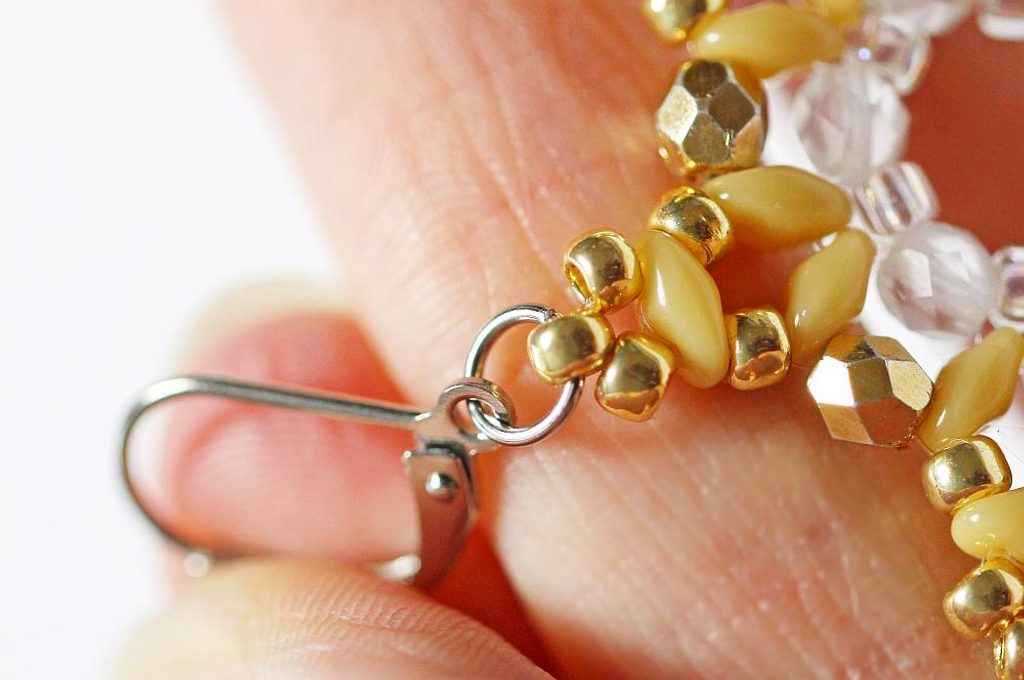 Zakončíme uzlíky a konce vlasce zapošijeme. Kleštičkami si otevřeme 4mm kroužek, provlékneme jej korálkem ve špičce, přidáme háček, kroužek zavřeme a první náušnice je hotová.