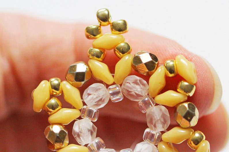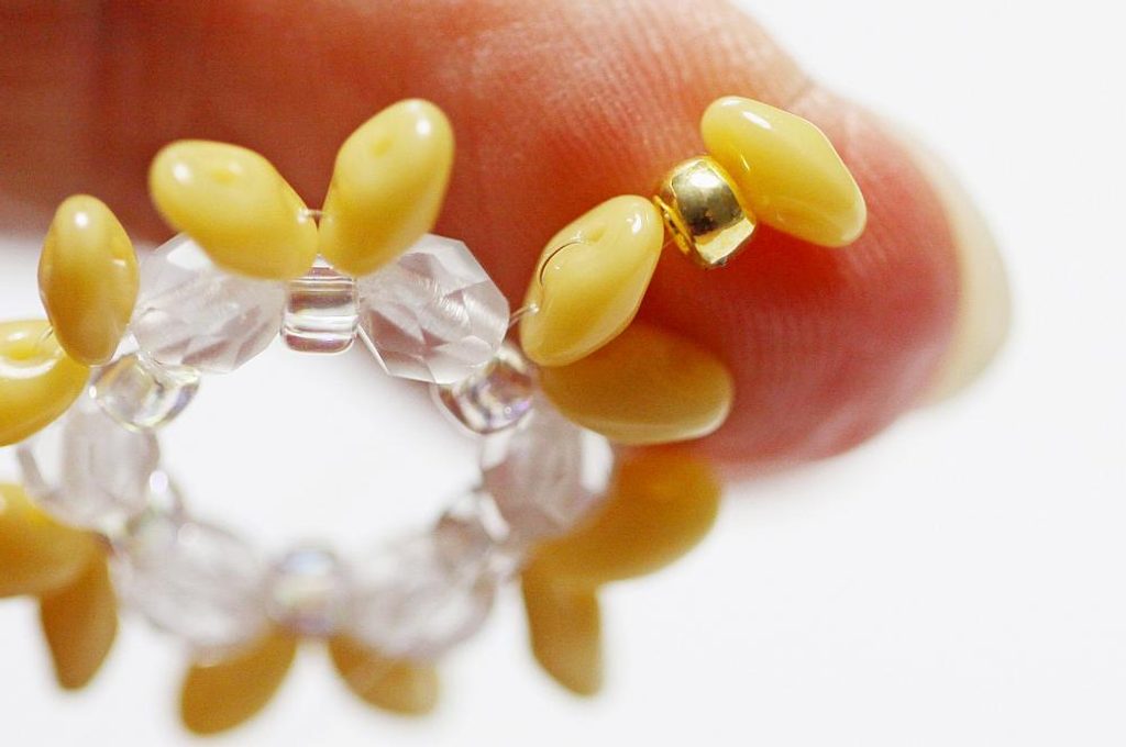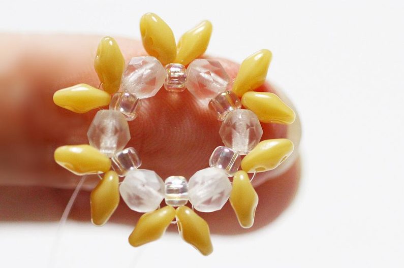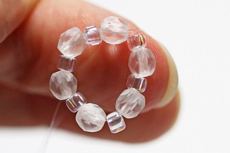 Ustřihneme si přibližně 1 metr vlasce. Navlékneme na jehlu a na vlasec navlékneme střídavě 1x TR8 a 1x BK4 – celkem 6x, na vlasci máme tedy 12 korálků. Uzlíky spojíme korálky v kroužek a jehlu protáhneme nejbližším BK4.