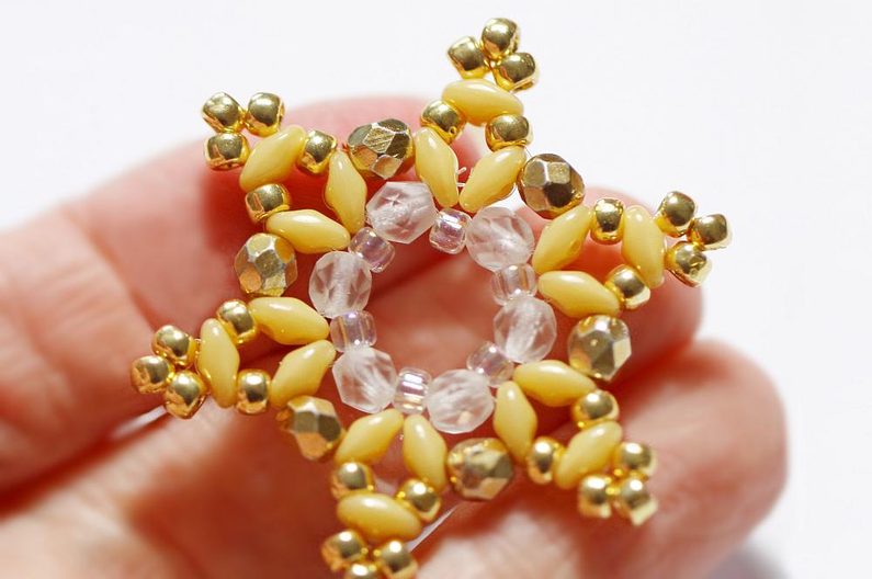 Nyní všijeme 3x TR8, coby špičky vrcholků vločky. To opět opakujeme po celém obvodu. Pro lepší pevnost celého šití v poslední řadě provlékáme vlasec takto: 3x nové TR8 a jehlu dál protahujeme MS, TR8, BK4, TR8, MS a zase 3x nové TR8 – tedy vynecháme MS mezi TR8 a BK4.