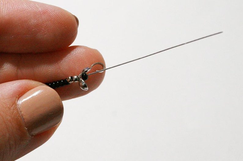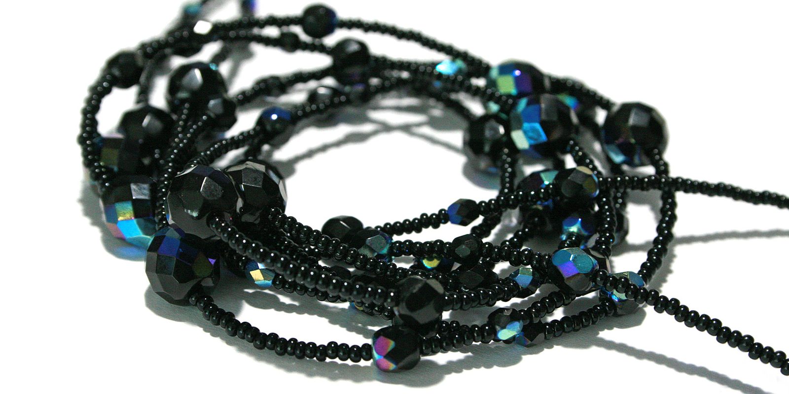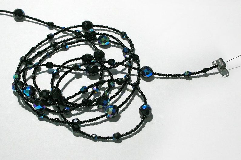 Tohle je nejjednodušší způsob, jak udělat náhrdelník metodou navlékání. Na lanko o délce cca 2 m navlékněte mix korálků různé velikosti, mezi korálky navlékejte 10–20 rokajlových korálků 10/0. Až budete mít kolem 1,8 m návleku (anebo délku, kterou si sami vyberete), uděláme zakončení. Navlékneme na lanko dva zamačkávací korálky, kalotu a jeden korálek 10/0, dále vynecháme korálek a projdeme skrz kalotu, zamačkávací korálky a ještě několik korálků a perliček v opačném směru a zatáhneme.