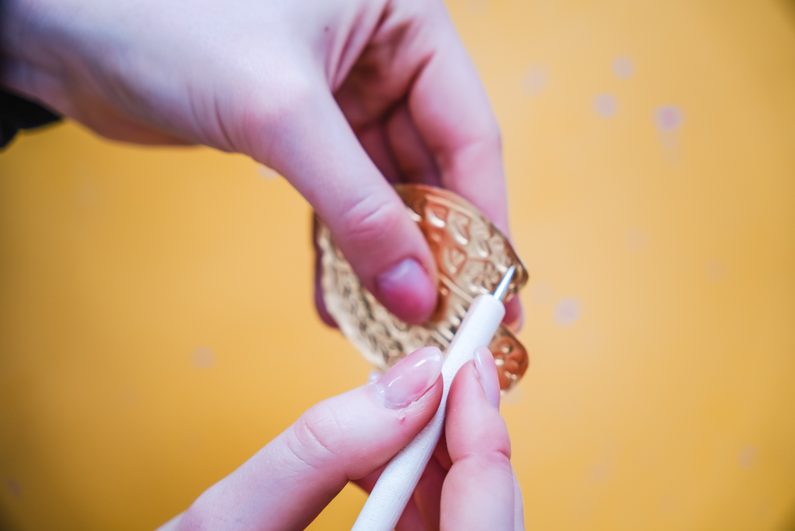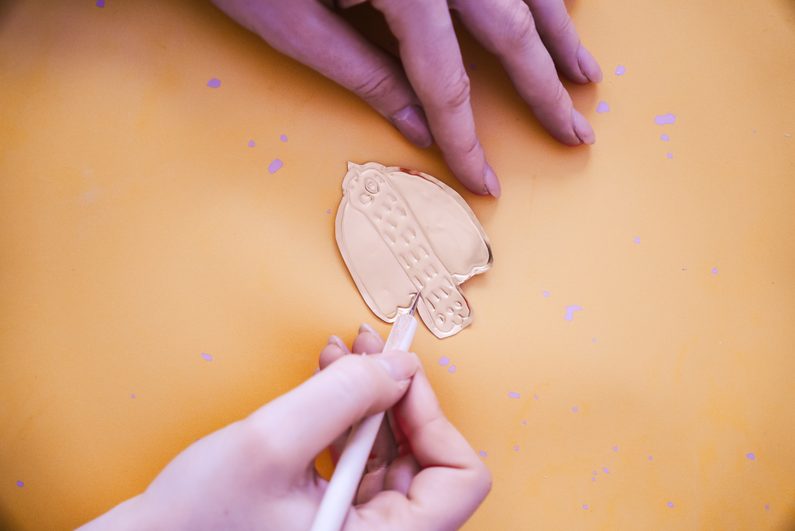 • Opět si vezmeme tečkovací nástroj a dozdobíme ptáčka. Uděláme dírku na pověšení.