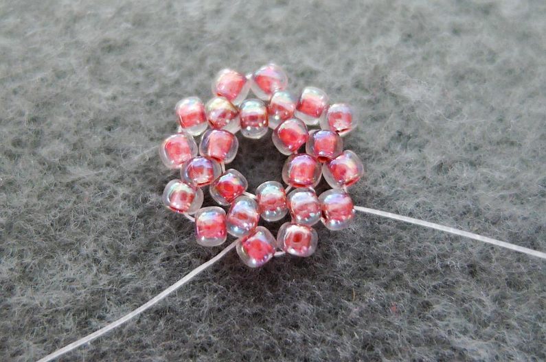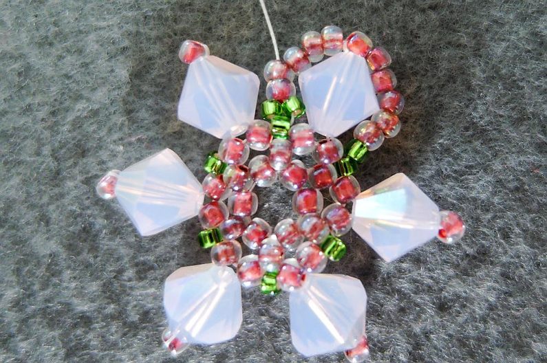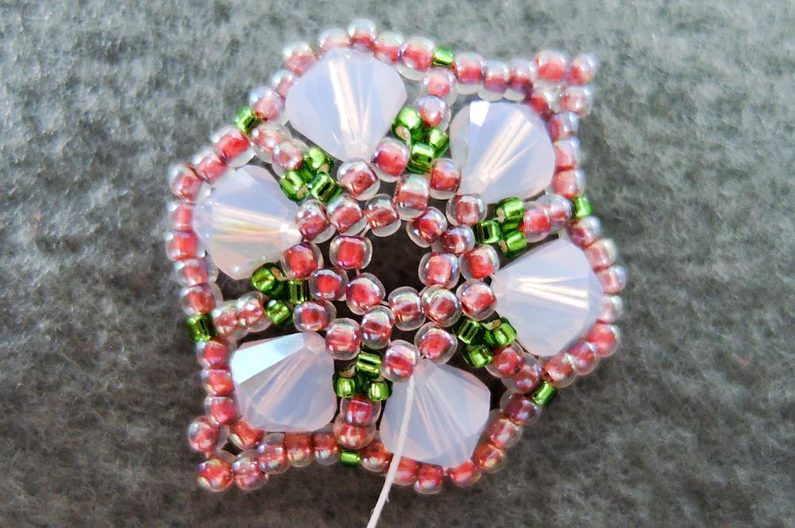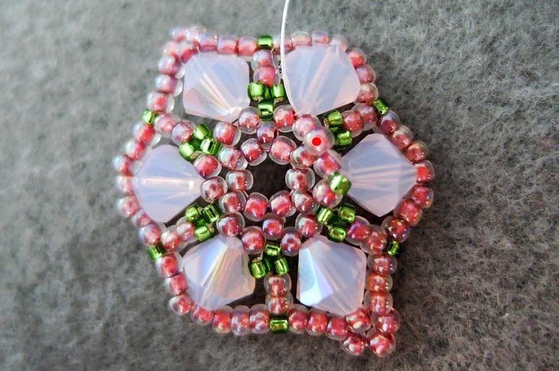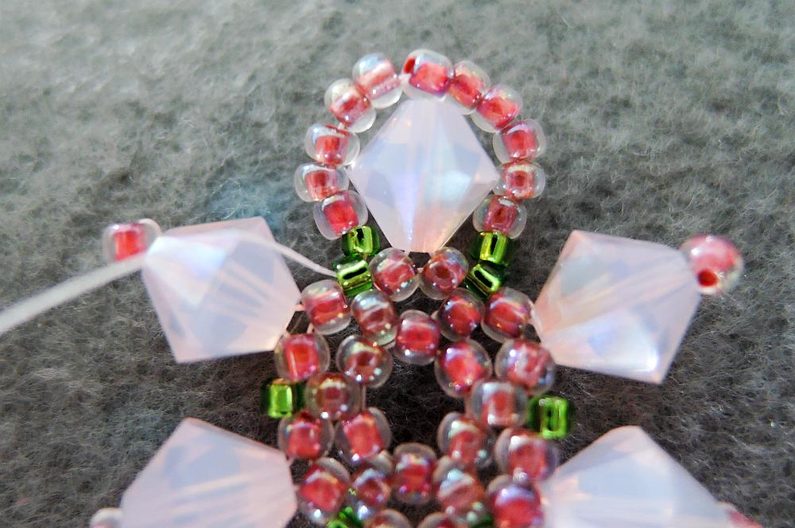 Navlečte 1 TR15, prošijte poslední dva navlečené TR11 z protilehlé řady (obr. 5), navlékněte 3 TR11 a prošijte TR11 ve špičce SW6. Takto postupujte po celém obvodu. V posledním obloučku přidejte pouze 3 TR11, směrem shora dolů prošijte první dva přidané TR11 a TR15 této řady a TR15 na středu (obr. 6). Poté přidejte 1 TR15 a prošijte následující TR11 směrem nahoru (obr. 7).