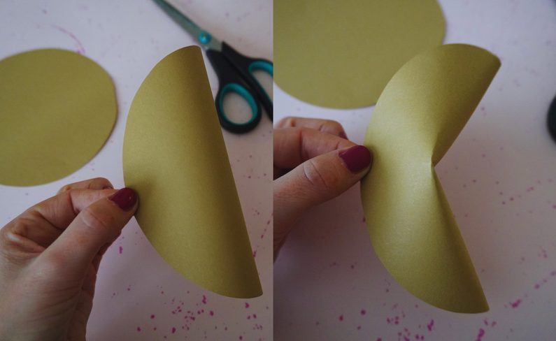 • Kolečko v polovině přehneme a uprostřed vmáčkneme dovnitř. Tak se nám vytvoří “skořápka”.