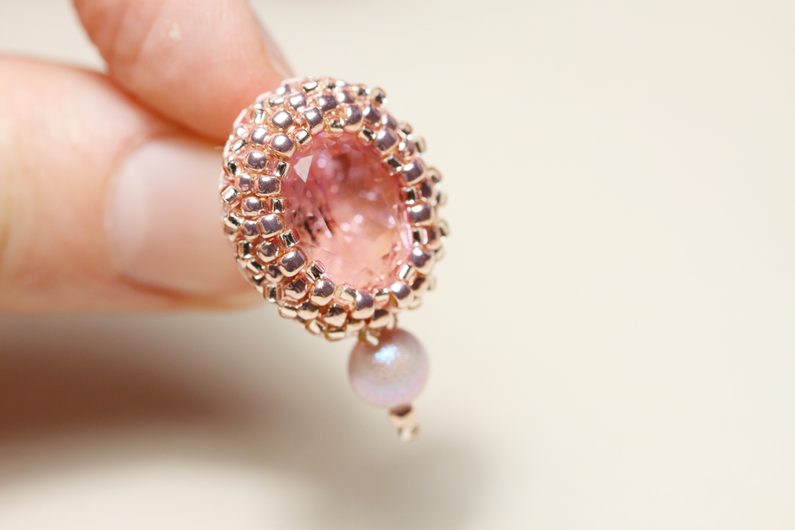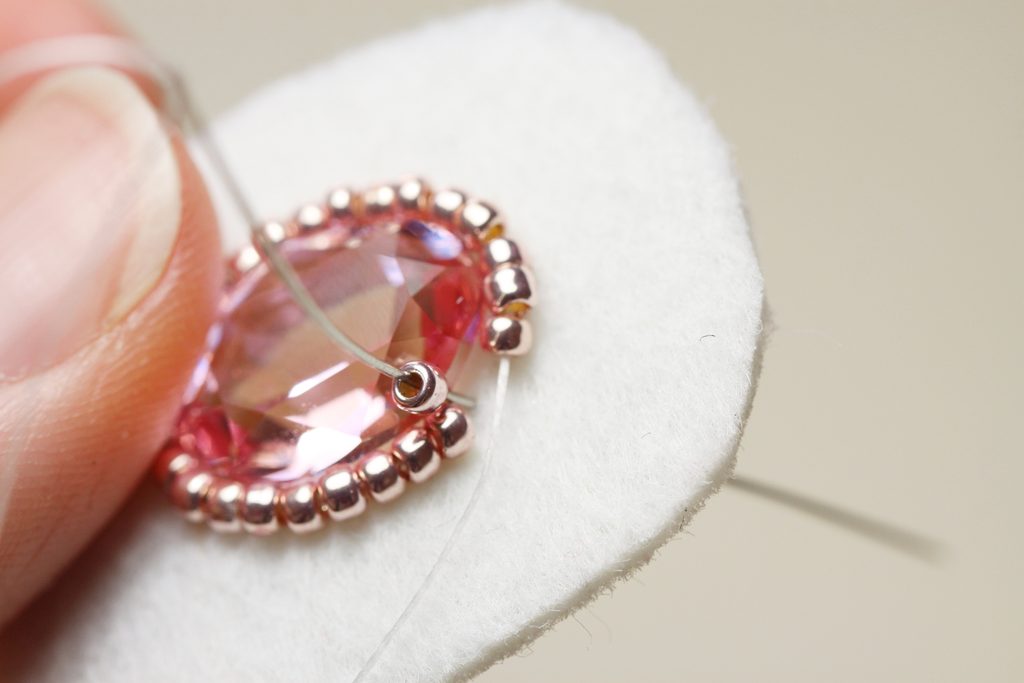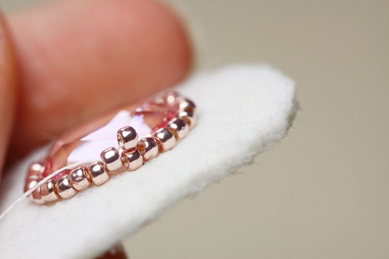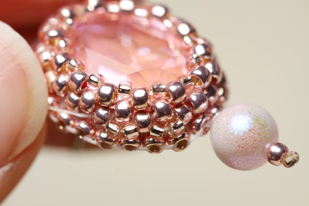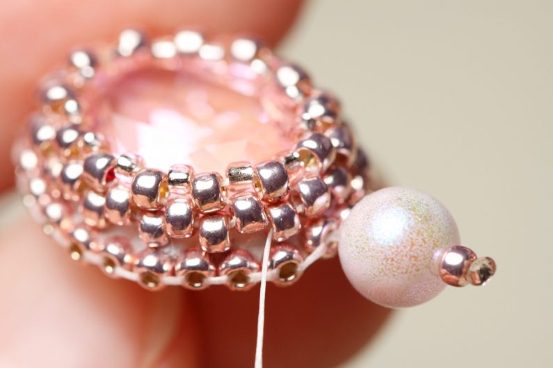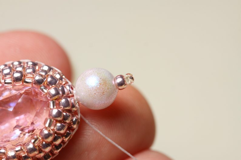 Na vrcholek oválku, který je dál od puzety, našijeme 6mm korálek Swarovski+TR11+TR15. Doporučuju protáhnout aspoň 2x, aby korálky dobře držely.