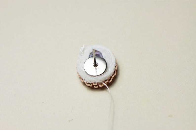 Jehlou se vrátíme do korálku v základní řadě obšití, který je nejblíž podkladu. Mezi každé dva takovéto korálky (tedy ob jeden korálek) všijeme 2x TR15. Poté zapošijeme a náušnice je hotová, zbývá už jen druhá. :)