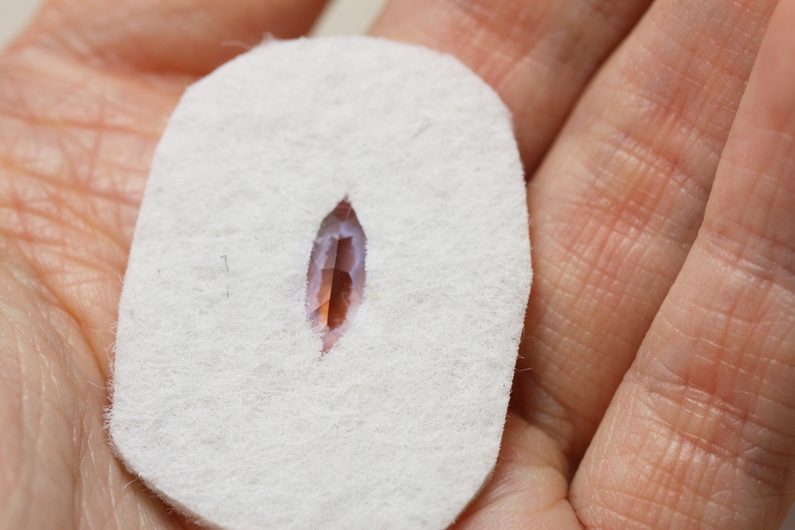 Odstřihneme přesahující poklad a z druhé strany nalepíme puzetku, necháme zaschnout.
