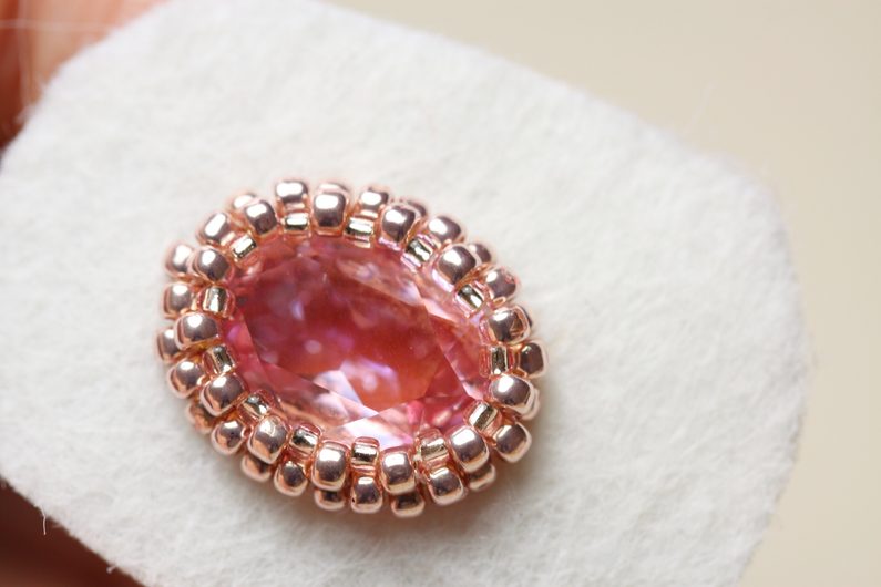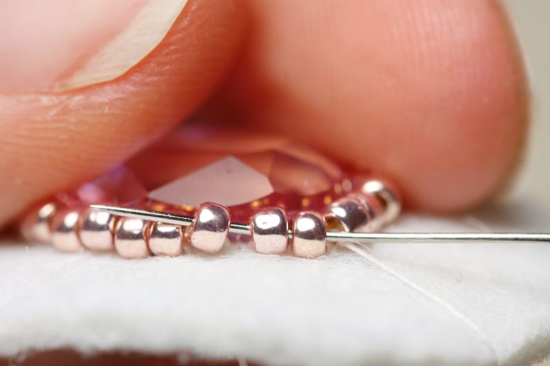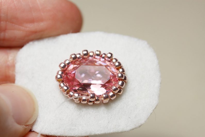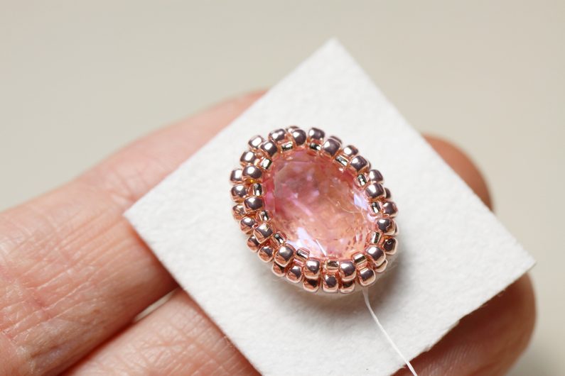 Do vzniklých mezer všíváme v další řadě vždy po jednom TR15, tím se „korunka“ stáhne kolem kamínku.