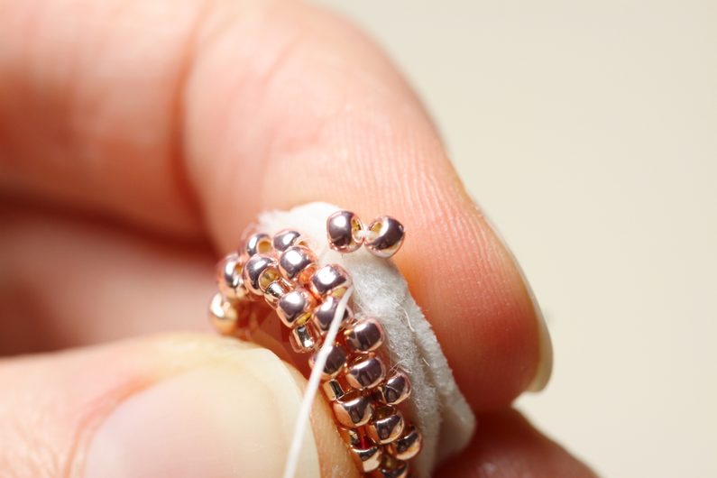 Když jsme už na konci, necháme si místo na jeden TR11. Všijeme jej, jehlou se vrátíme o dva korálky a protáhneme ji jimi – plus prvním korálkem v řadě.