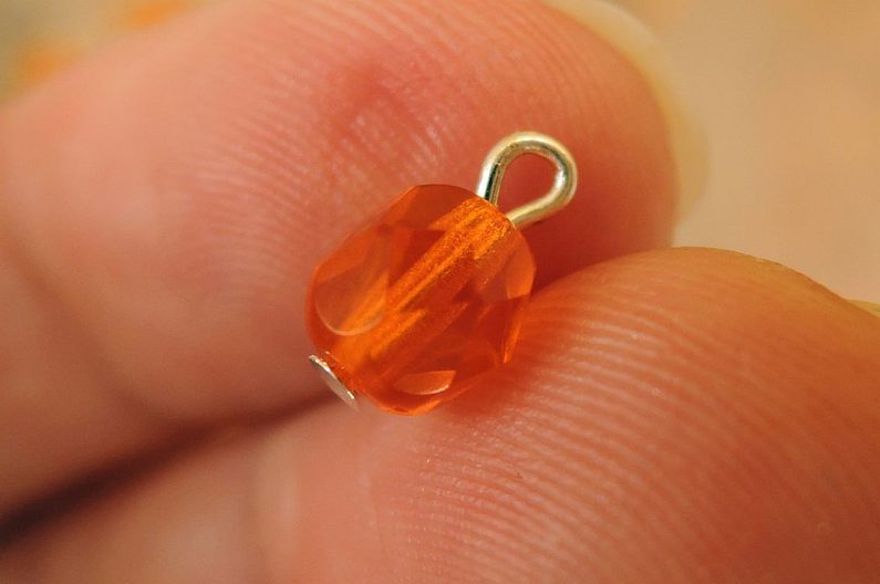 Ketlovací jehlu si provlékněte korálkem, zkraťte na druhé straně štípacími kleštěmi na cca 8 mm (pozor, ať vám odštípnutý konec nevletí do oka, přidržujte ho!). Jehlu ohněte plochými kleštěmi do pravého úhlu.