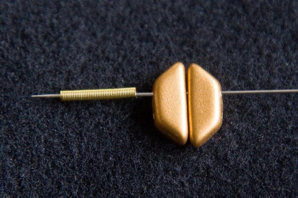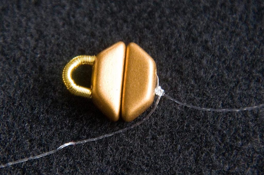 Na vlasec cca 1,5 m dlouhý navlékneme 2× TP delšími stranami k sobě a 1 cm French wire, nebo můžete použít i kovový vodič ve tvaru podkůvky, případně 7× TR15 (Obr. 1). Prošijeme druhou dírkou obě TP (Obr. 2). Stáhneme cca 10 cm od konce vlasce a svážeme uzlíkem. French wire se ohne do „podkůvky“ a ochrání vlasec (Obr. 3).