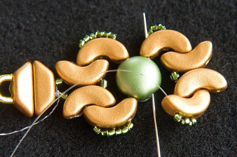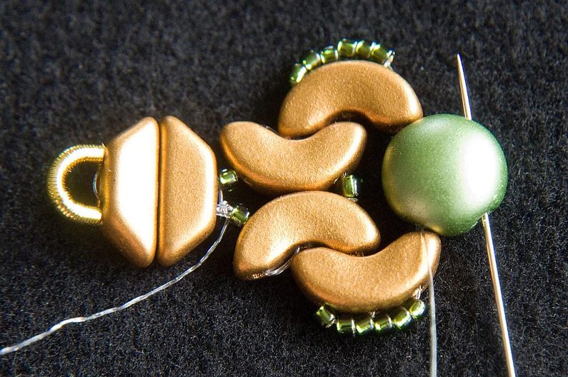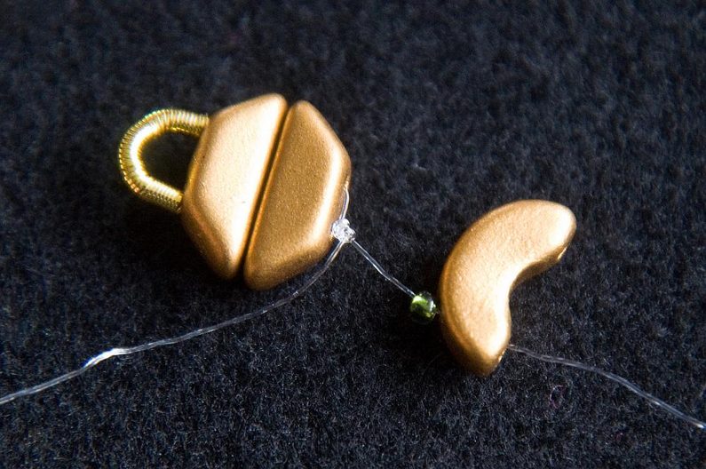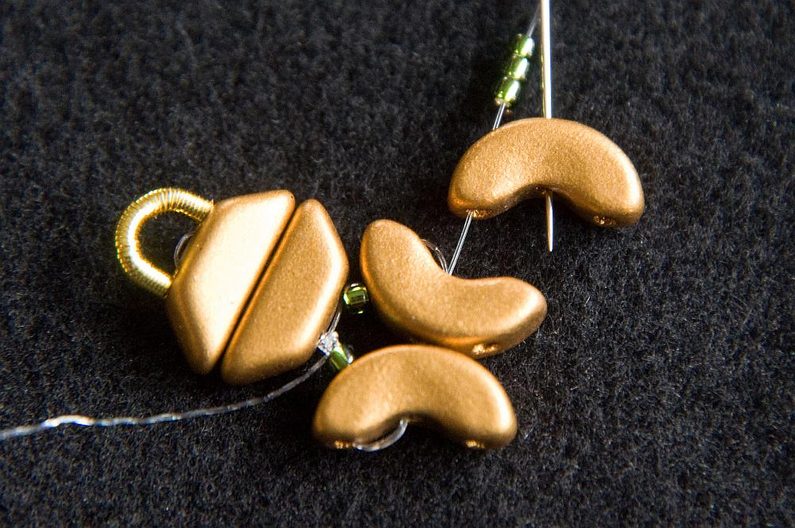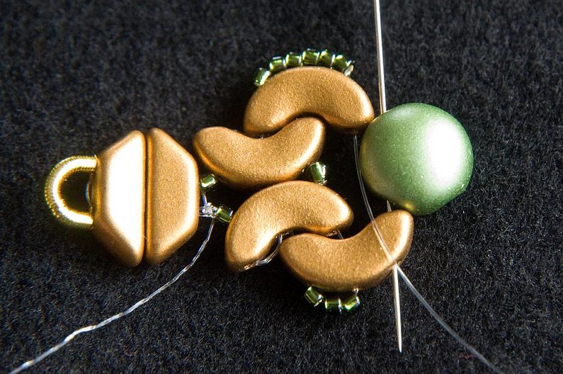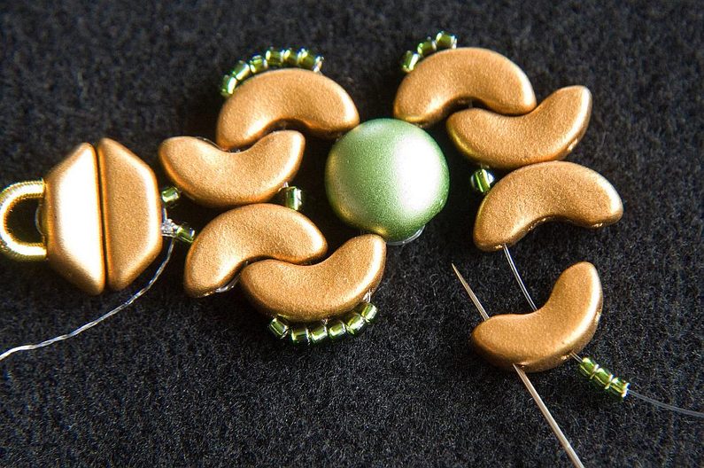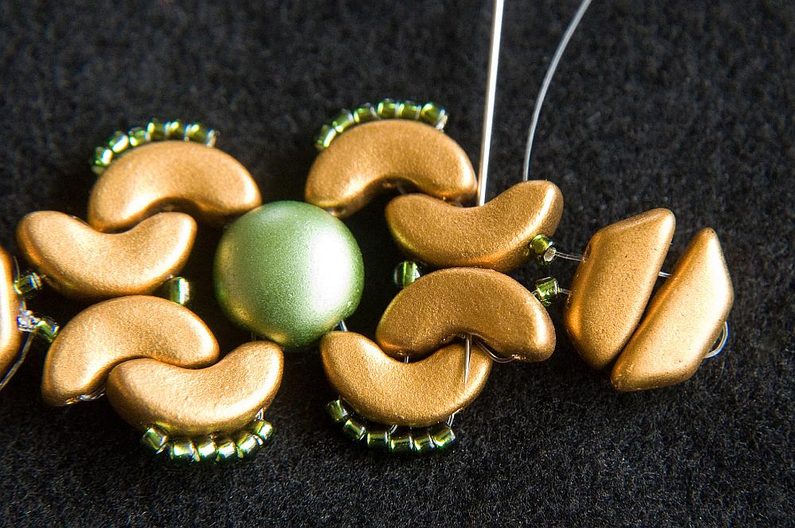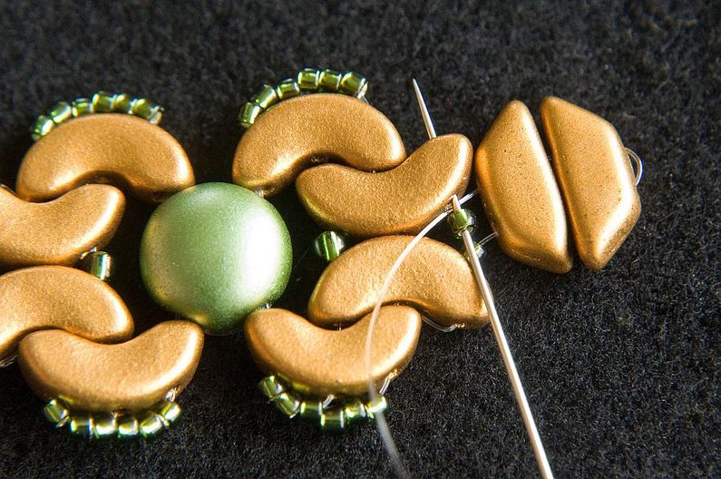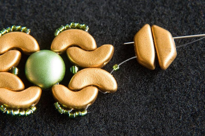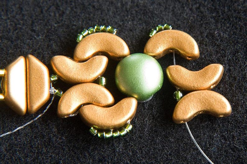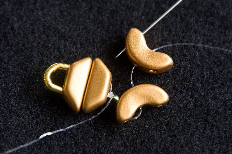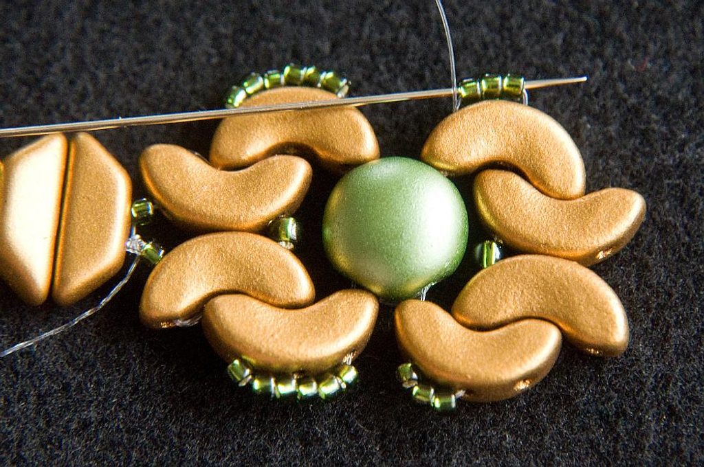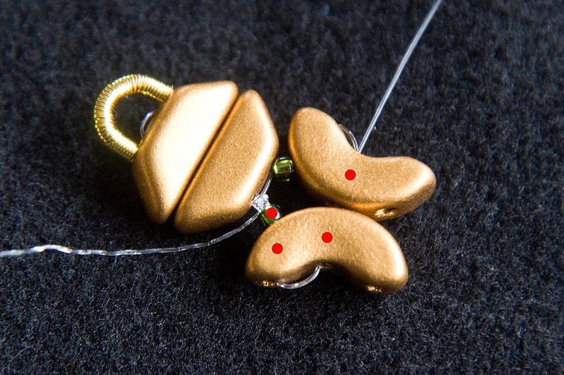 Provlékneme obě TP druhou dírkou (Obr. 9). Provlékneme ještě i následující TR15, AP krajní i prostřední dírkou a následující AP prostřední dírkou (Obr. 10). Navlékneme 1× AP krajní dírkou zevnitř, 3× TR15 a provlékneme prostřední dírku AP zvenku (Obr. 11). Stáhneme k sobě, AP do sebe hezky zapadnou. Provlékneme následující krajní dírku AP zevnitř (Obr. 12). Navlékneme 1× TR11 a provlékneme následující krajní dírku AP zvenku (Obr. 13).